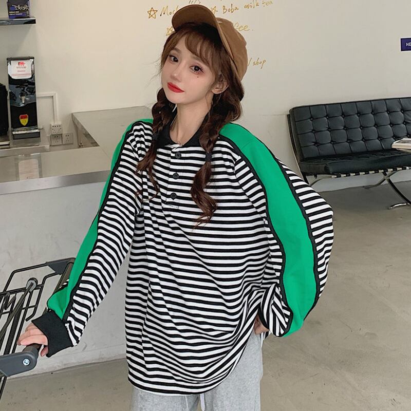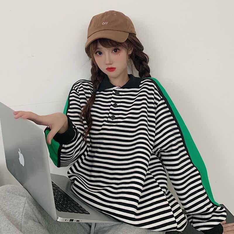 スプリング秋物韓国ファッションフードラウンドネックストライプルーズセーター ロング 春物 オータム Oネック ステッチ スタイル 長袖 コーデ marchs6721299103688