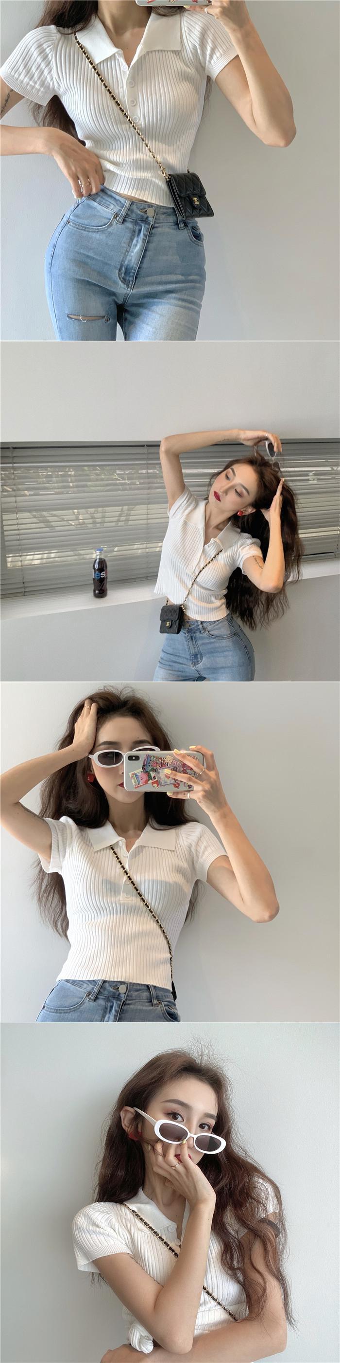夏服韓国ファッションスタンダードショートボタンニットトップス スリムホワイトVネックゆったりTシャツ レトロ 夏物 コーデ Marchs50914888152