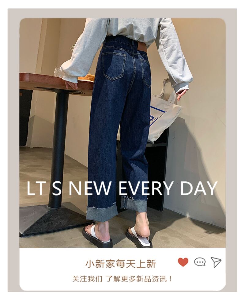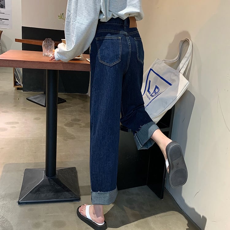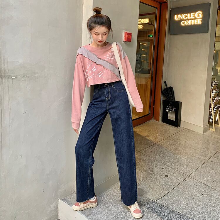ダークブルーハイウェストジーンズ 秋物スタンダードスタイルルーズワイドレッグ レトロ オータム ワイドパンツ ウエスト コーデ Marchs89736384810