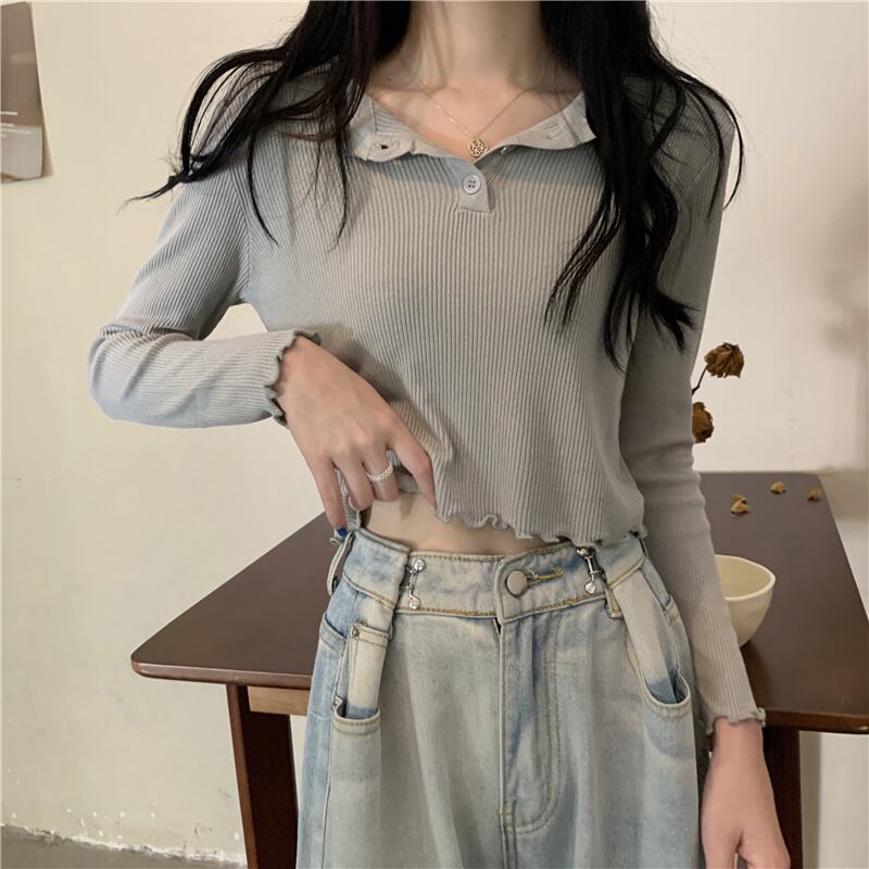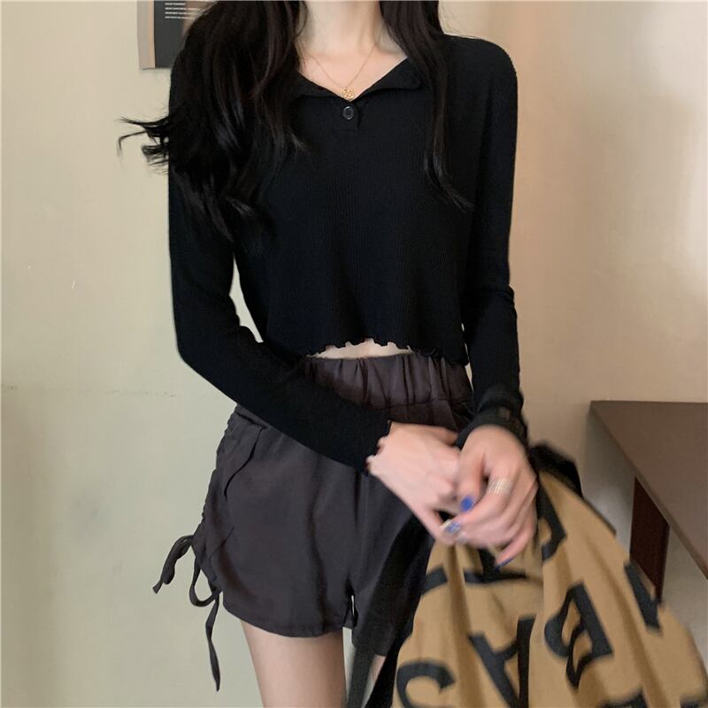 Tシャツシャツ 秋物ニットゆったりショートトップス ハイウェストウェストパンツ ロング オータム 長袖 ウエスト コーデ Marchs10152653786