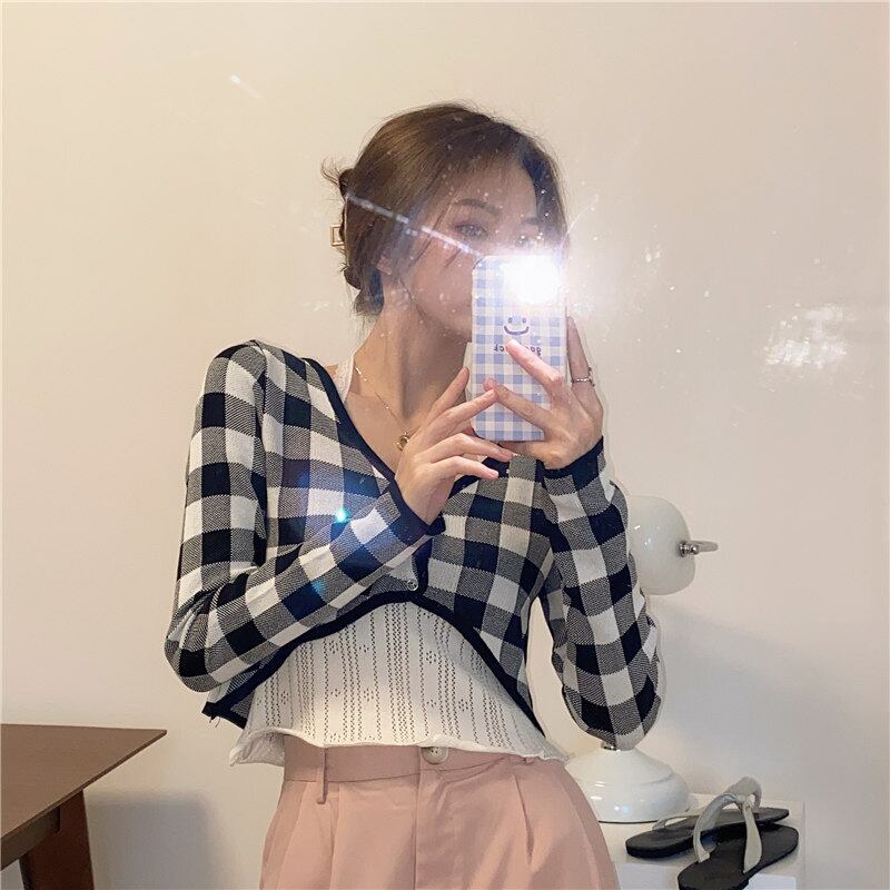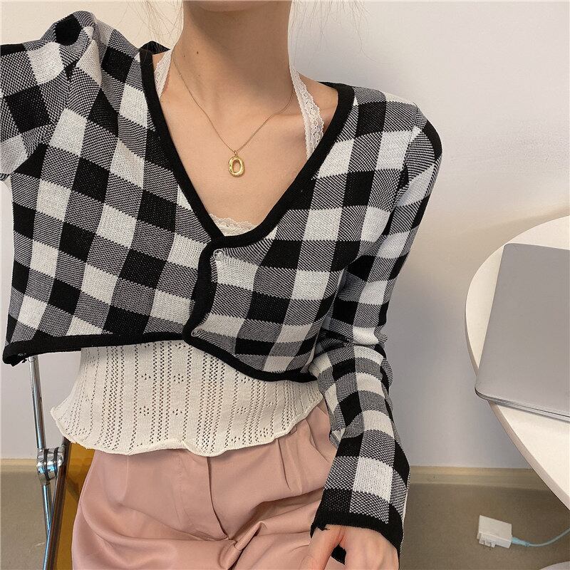 秋物Vネックショート格子柄ニットカーディガンジャケット ホルターレースレディース オータム コーデ Marchs79355600949