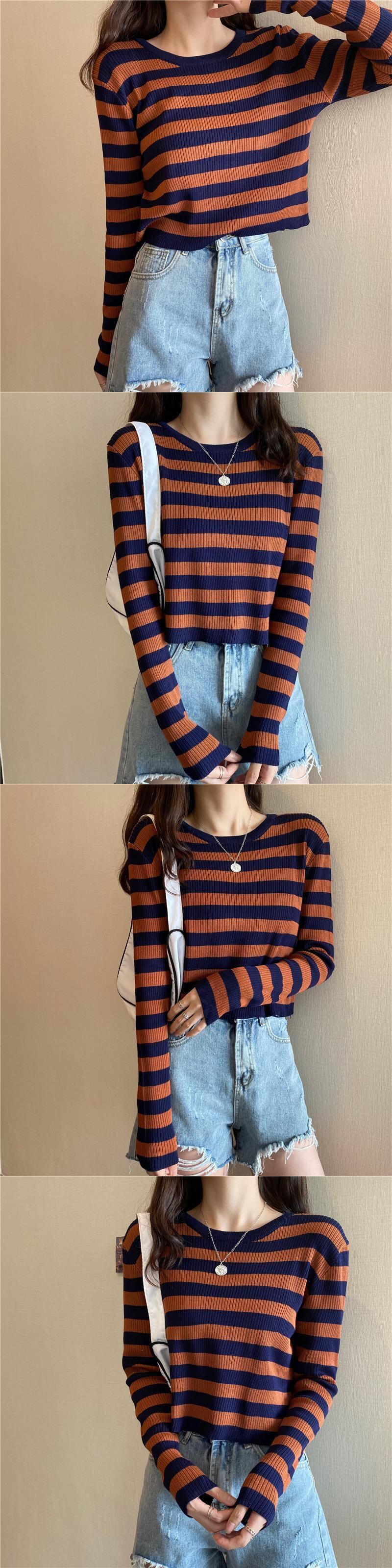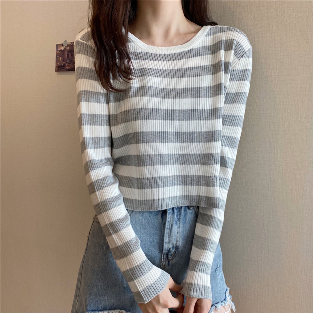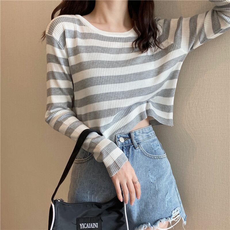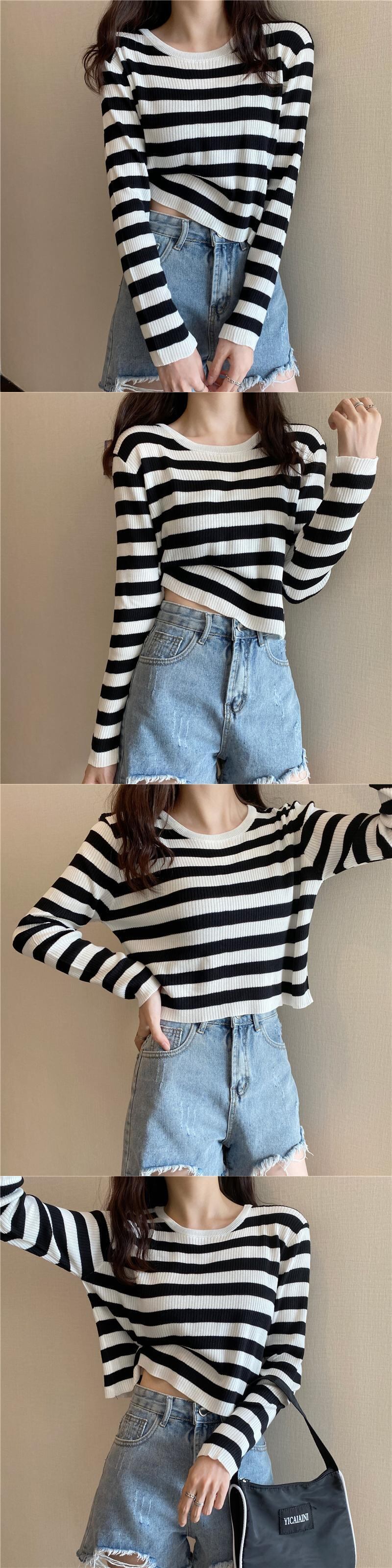 ブラックホワイトストライプTシャツシャツ スプリング秋物ニットゆったりスタイルクロップドトップス ハイウェストウェストパンツ ロング 春物 オータム 長袖 ウエスト コーデ Marchs26017656460