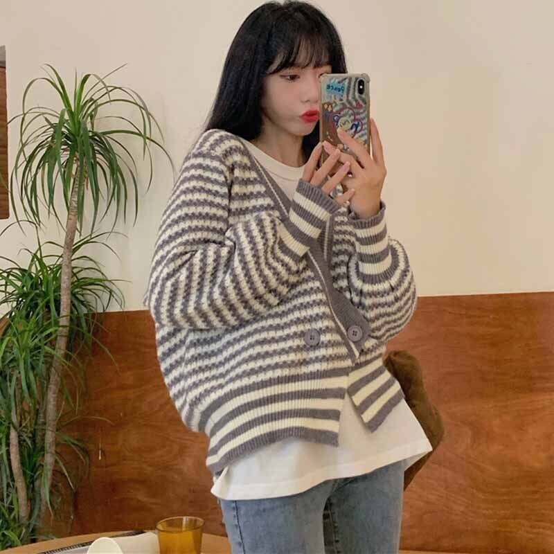 スプリング秋物韓国ファッションカラーストライプカーディガンルーズショートニットジャケット レディース 春物 オータム スタイル コーデ marchs6789669526776