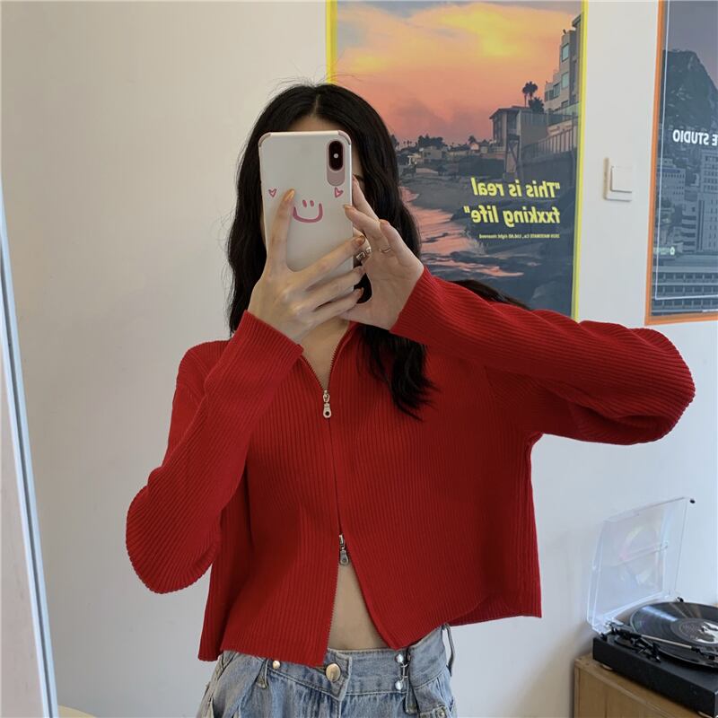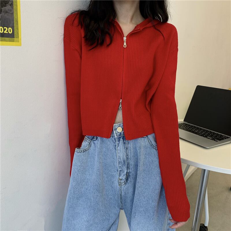 ジッパーフードニットカーディガンジャケット スプリング秋物ウェストショートスリムトップス スタイル 春物 オータム ウエスト コーデ Marchs28953083405