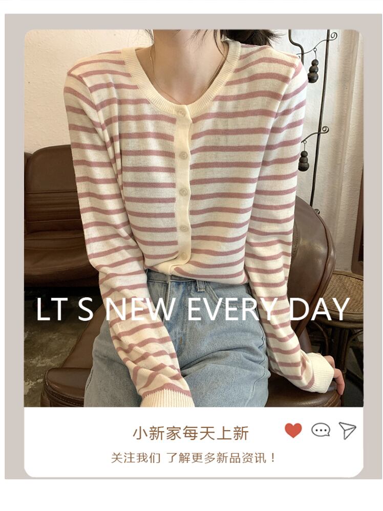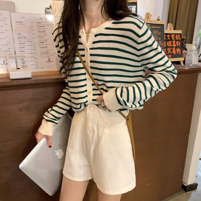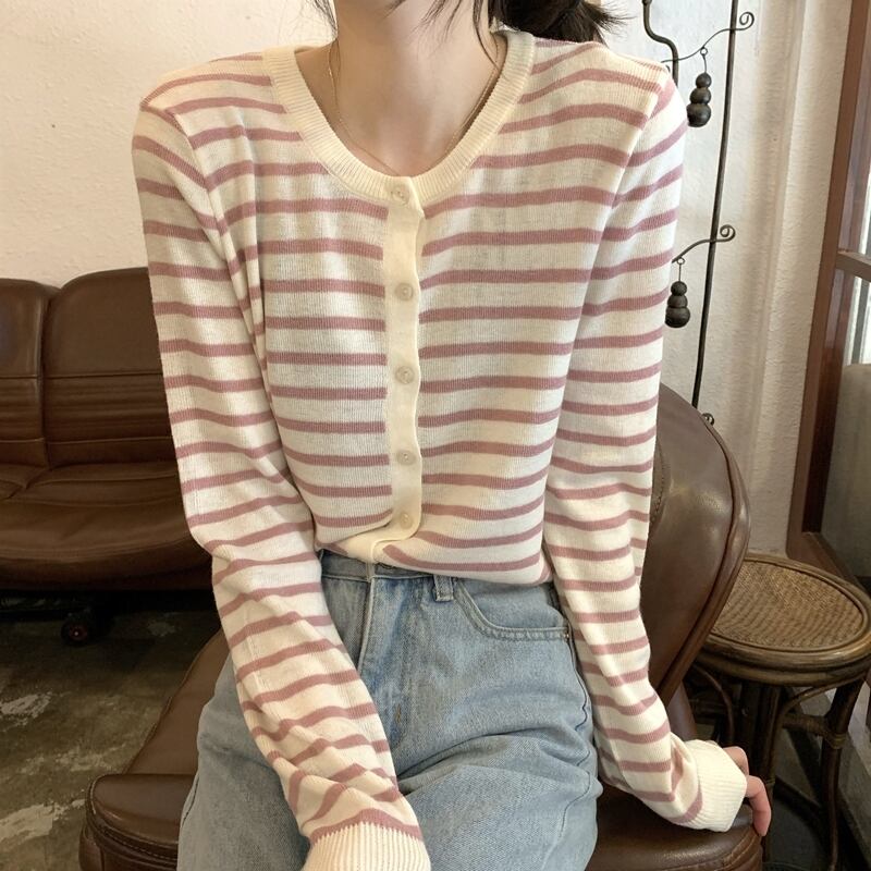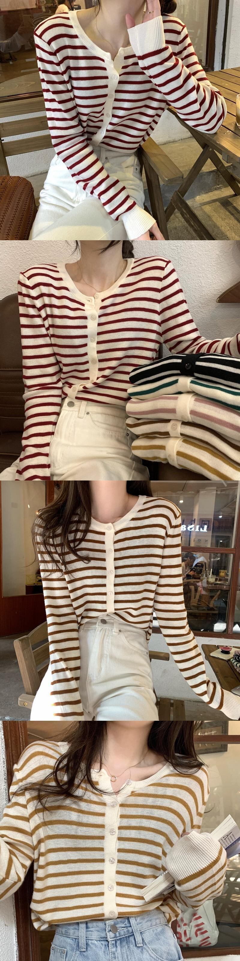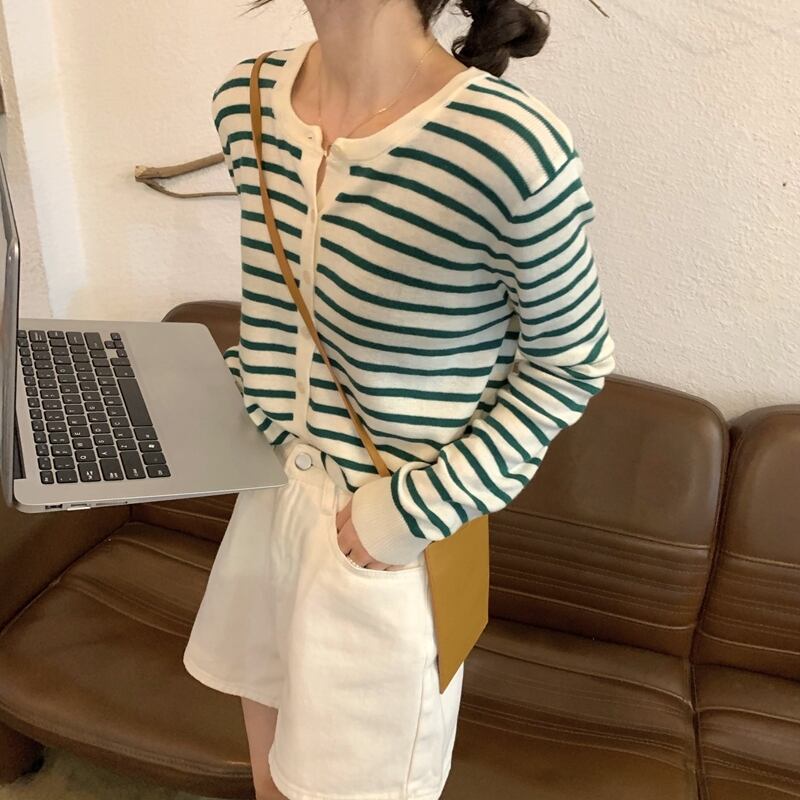 秋物ストライプニットカーディガントップス ルーズゆったりシャツ ロング オータム 長袖 コーデ Marchs57678174013