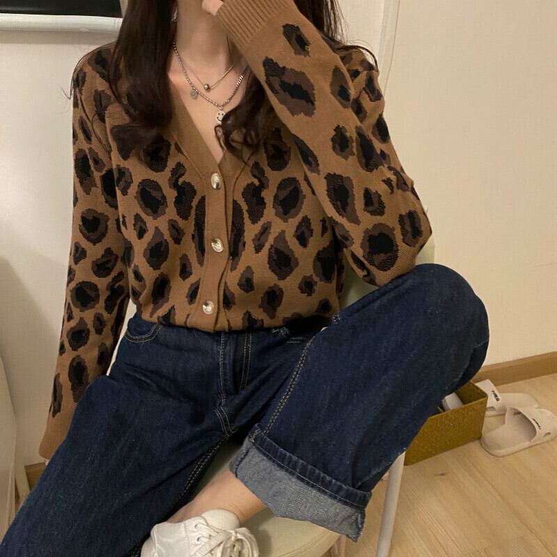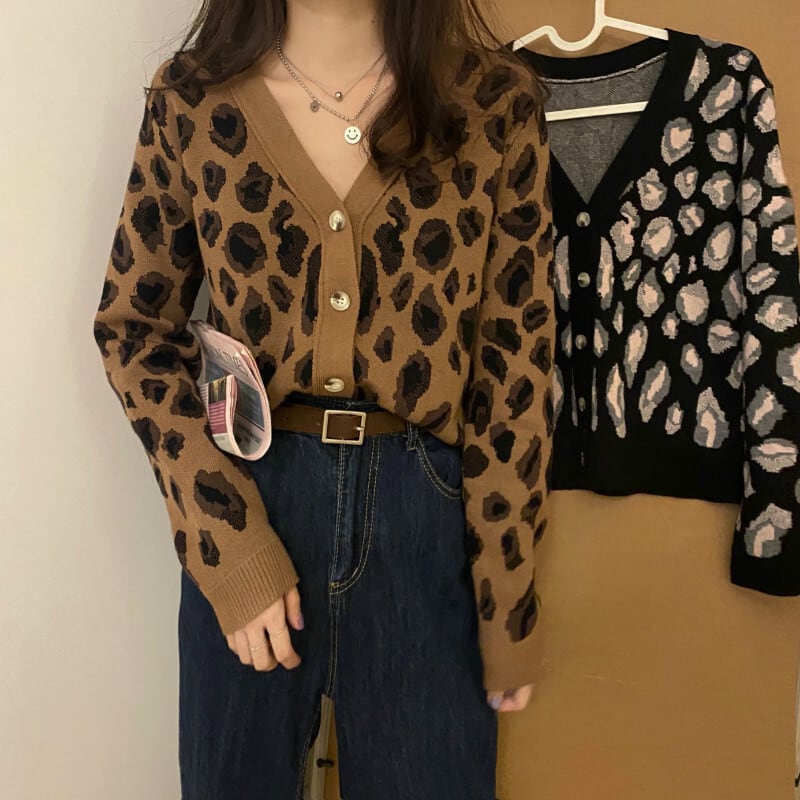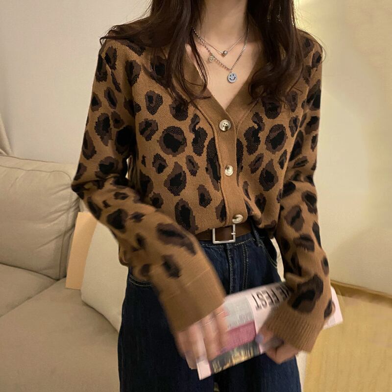 ショートカーディガンセーター 秋物スタンダードレオパードプリント柄ジャケット Vネックニット レトロ オータム コーデ Marchs7378887284