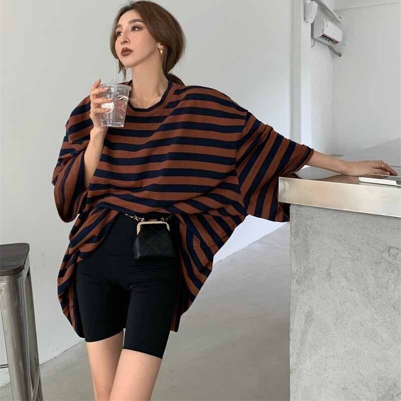スタイルストライプクロップドTシャツスプリング秋物ルーズトップス 春物 オータム ミドル丈 コーデ marchs6762475421918