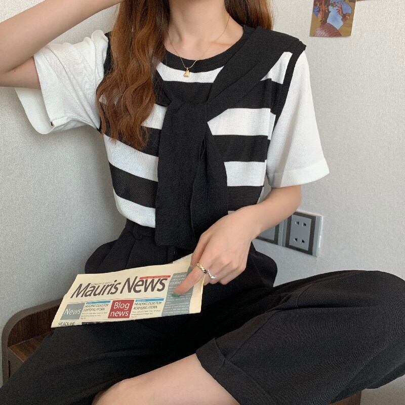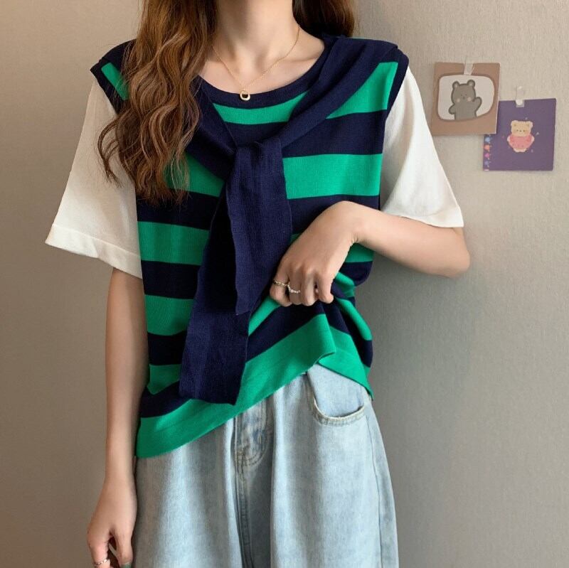 夏服韓国ファッションスタイル薄手カラーストライプTシャツニットトップス レディース 夏物 コーデ marchs6713606668563