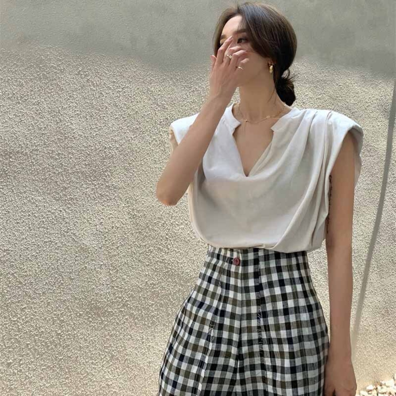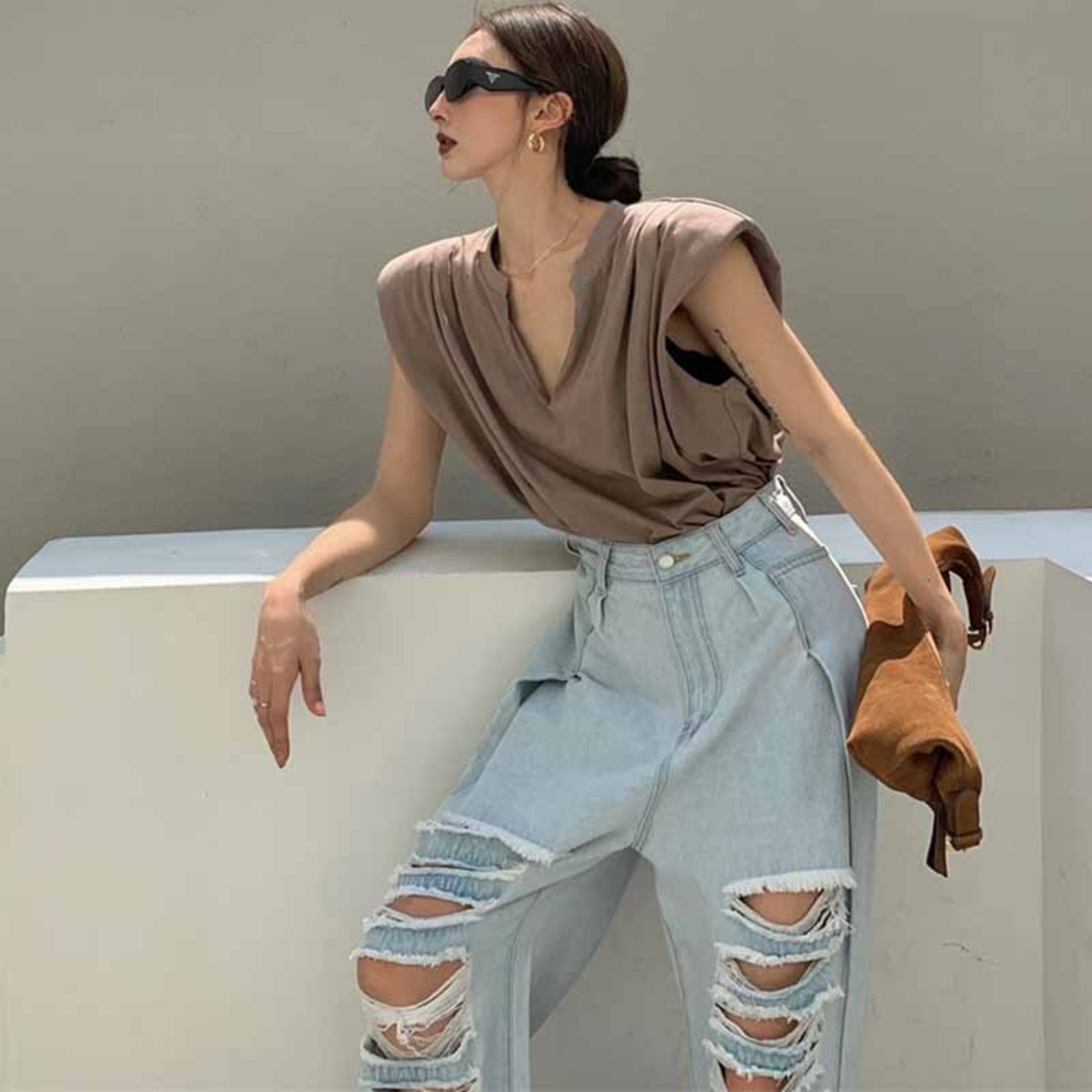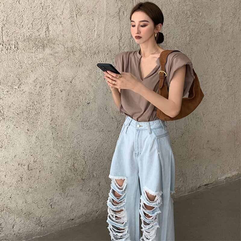 ノースリーブTシャツ夏服スタイルルーズホワイトVネックトップス 夏物 コーデ marchs6724144726893