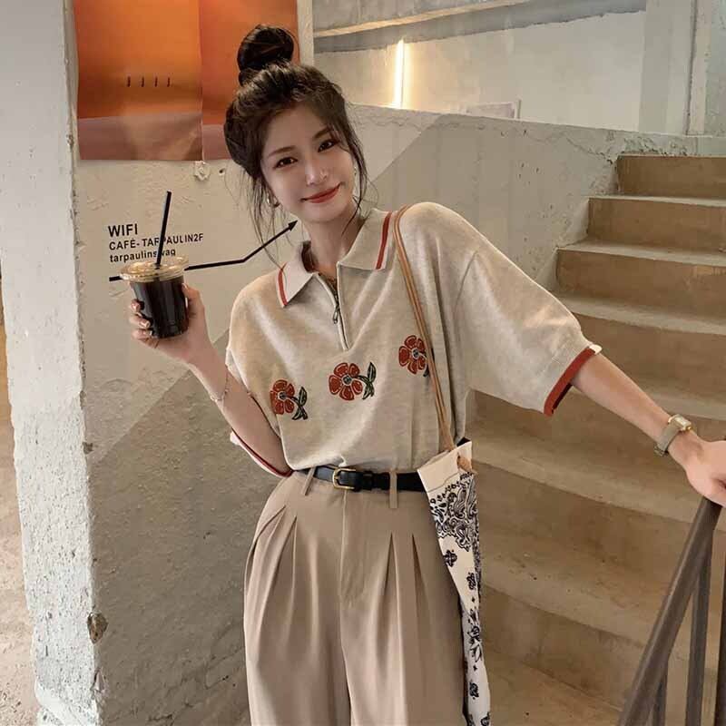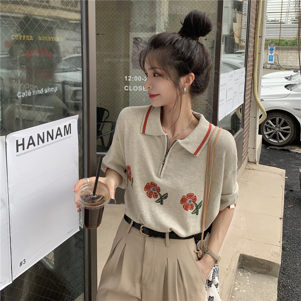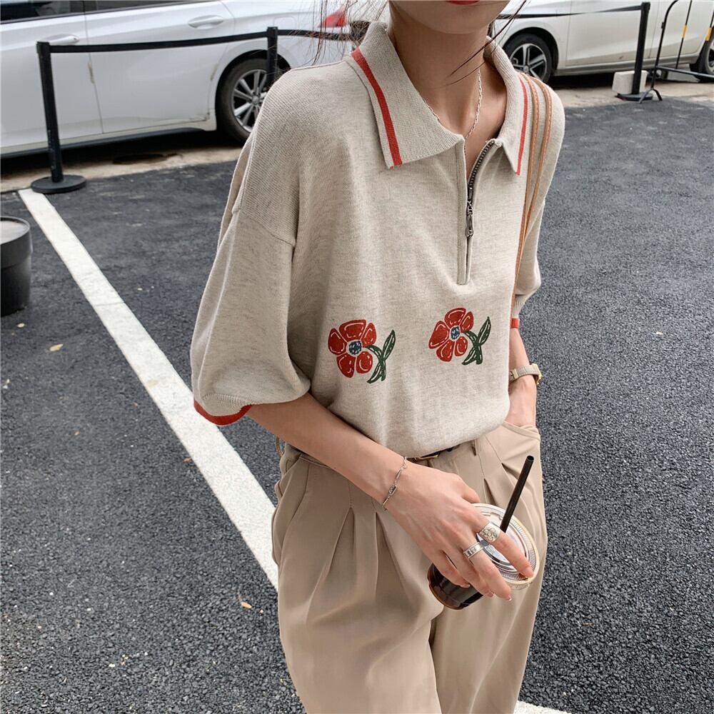 薄手ニットTシャツシャツ レディース夏服ジッパー 大人ガーリー スウィート キュート カジュアル 夏物 フラワーデザイン コーデ marchs6798760917336