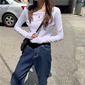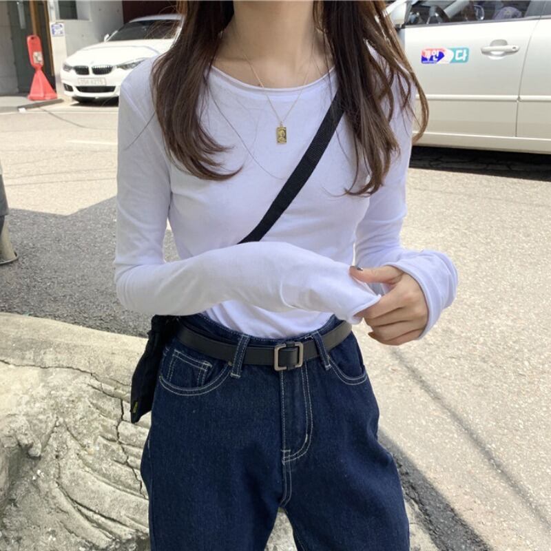 秋物ホワイトTシャツシャツ レディース薄手ラウンドネックトップス スリム ロング コットン オータム Oネック ピュア 長袖 コーデ Marchs28546079382