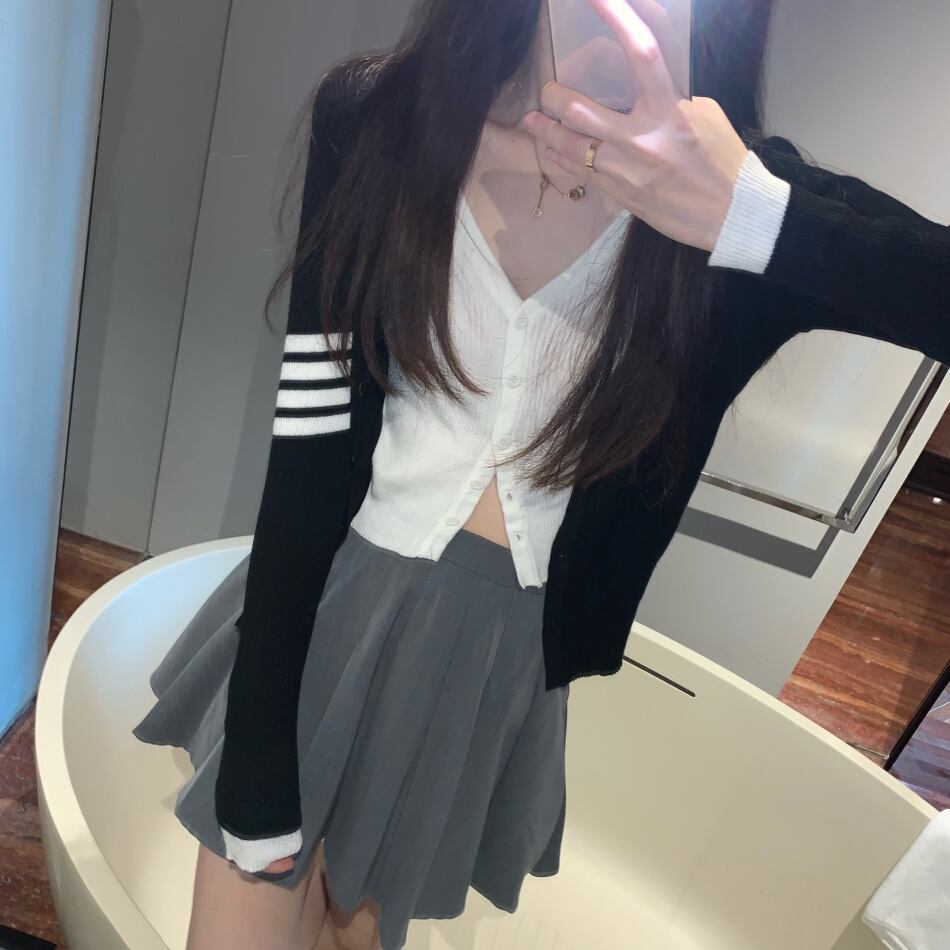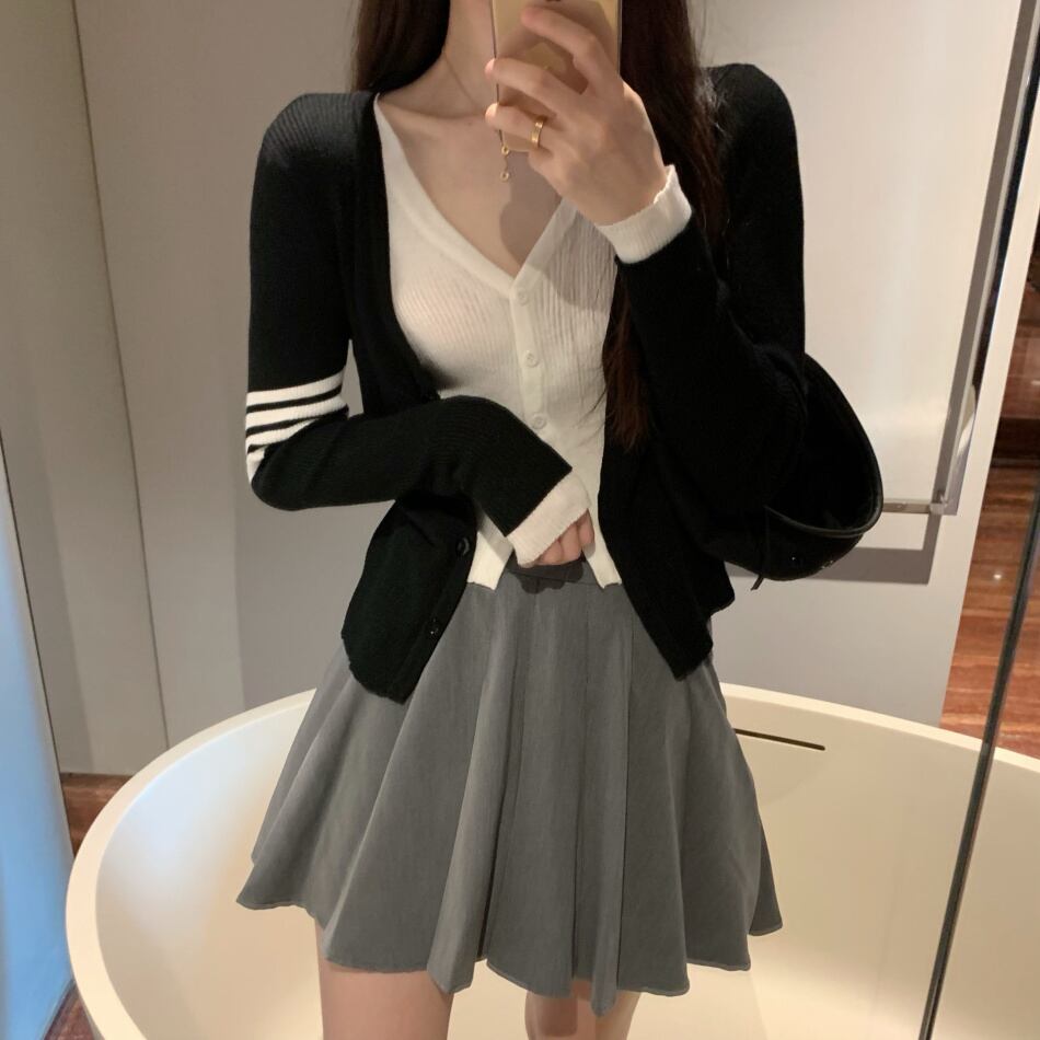 ツーピース Vネックニットカーディガンスプリング秋物薄手ショートトップス 春物 オータム ステッチ コーデ marchs6781598252316