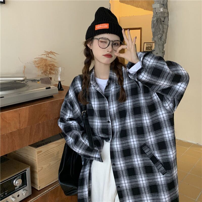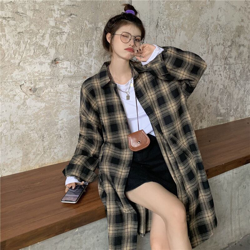 韓国ファッション格子柄シャツ ジャケット スプリング秋物スタンダードルーズトップス レトロ 春物 オータム ミドル丈 コーデ marchs6797033143117