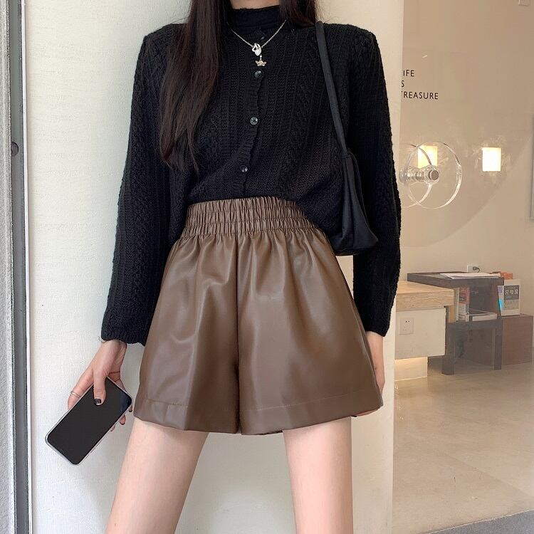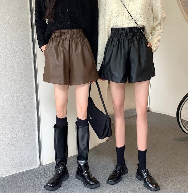 ブラックレザーショーツ スプリング秋物ブーツパンツ ウェスト薄手Aラインワイドレッグ 靴 シューズ 春物 オータム ワイドパンツ ウエスト コーデ marchs6777186235612