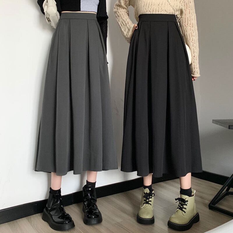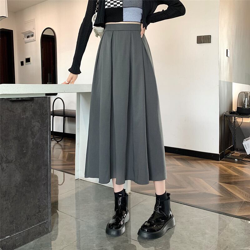 スプリング秋物プリーツソリッド カラーAライン ハイウェスト 春物 オータム スカート ソリッドカラー ウエスト ミドル丈 コーデ marchs6752367719384