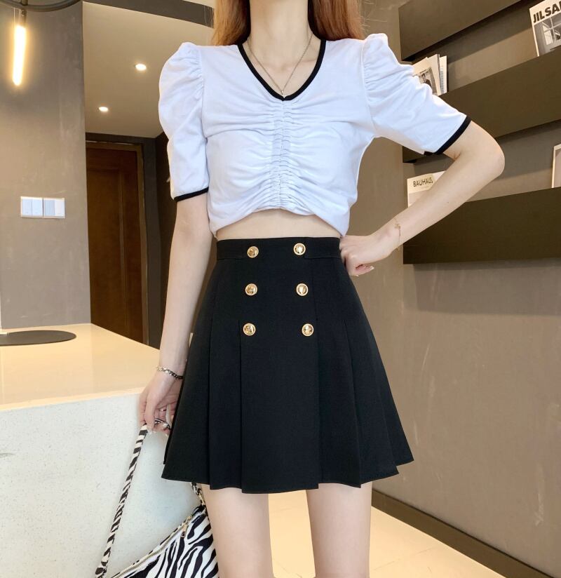 ウェストスリムブラックプリーツスカート Aラインスプリング秋物 春物 オータム ウエスト コーデ marchs6756569233004