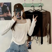 スプリング秋物韓国ファッションスタイルギャザーショートトップス Tシャツシャツ ゆったり ロング 春物 オータム スクウェア 長袖 コーデ marchs6741713573570