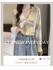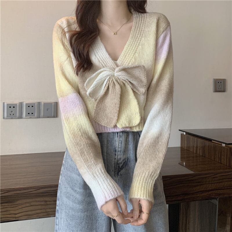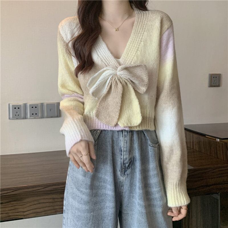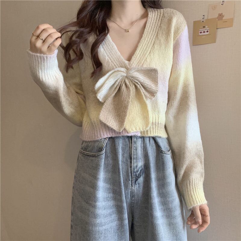 リボンストライプニットトップス 秋物ショート長袖スリーブ薄手セーター ロング 大人ガーリー スウィート キュート カジュアル オータム コーデ Marchs96954601998