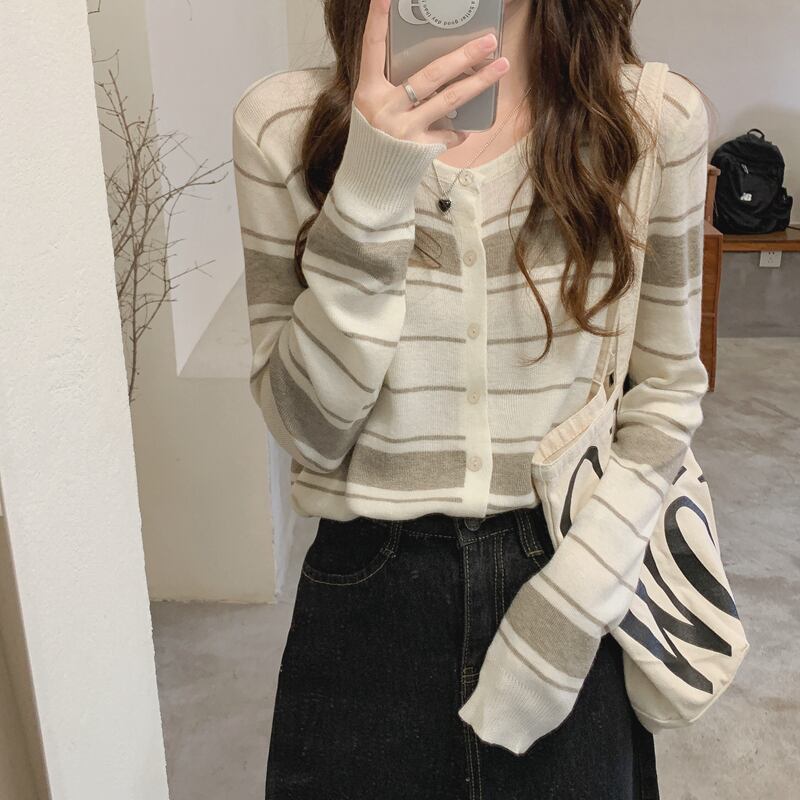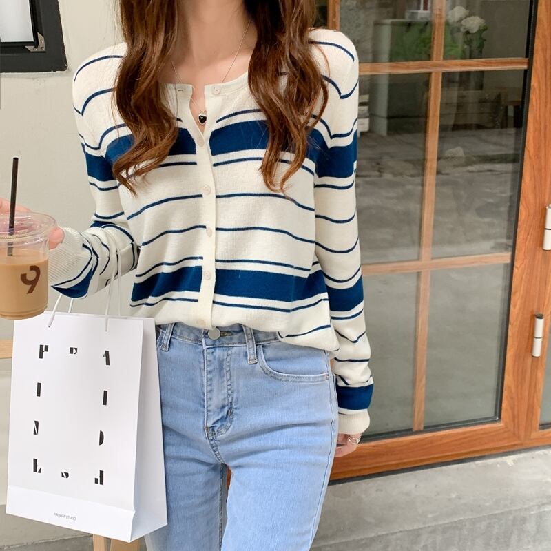 スタイルスプリング秋物ストライプセーター ラウンドネックカーディガンシャツ ロング 春物 オータム Oネック 長袖 コーデ Marchs61252892792