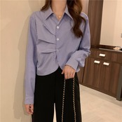 ブルーストライプシャツ レディーススプリング秋物プリーツショートトップス ロング 春物 オータム 長袖 コーデ Marchs80031136913