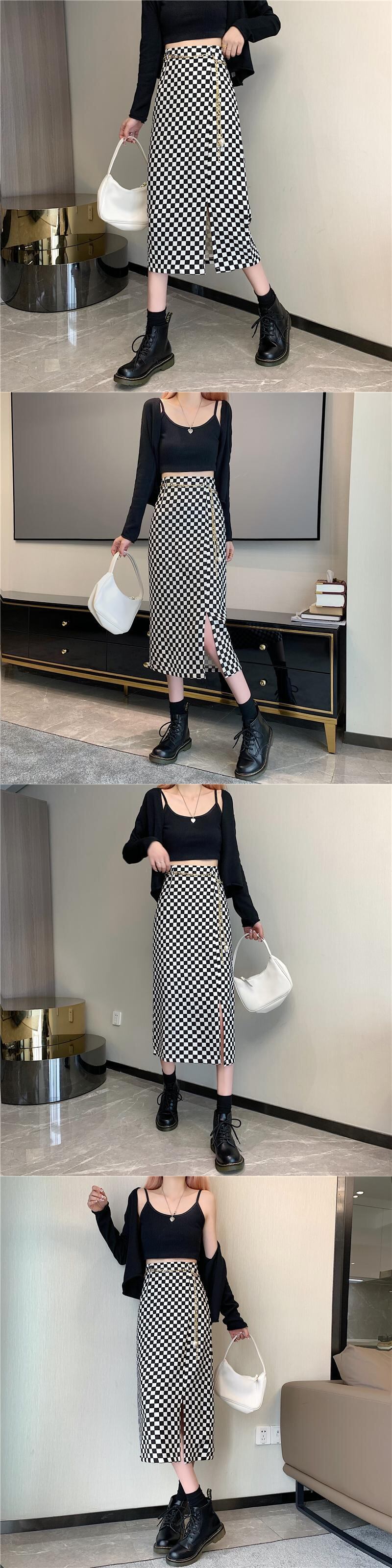 ブラックホワイト格子柄スカート レディース秋物ハイウェストウェストスタンダード レトロ オータム ウエスト ミドル丈 コーデ Marchs80392944124