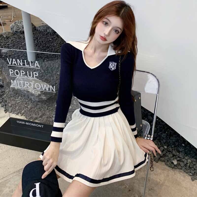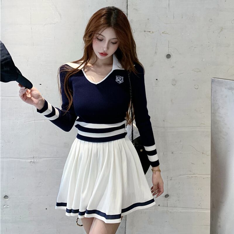 カジュアルスプリング秋物スタイルストライプニットトップス プリーツスカート 春物 オータム コーデ marchs6733541585865