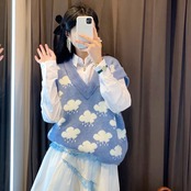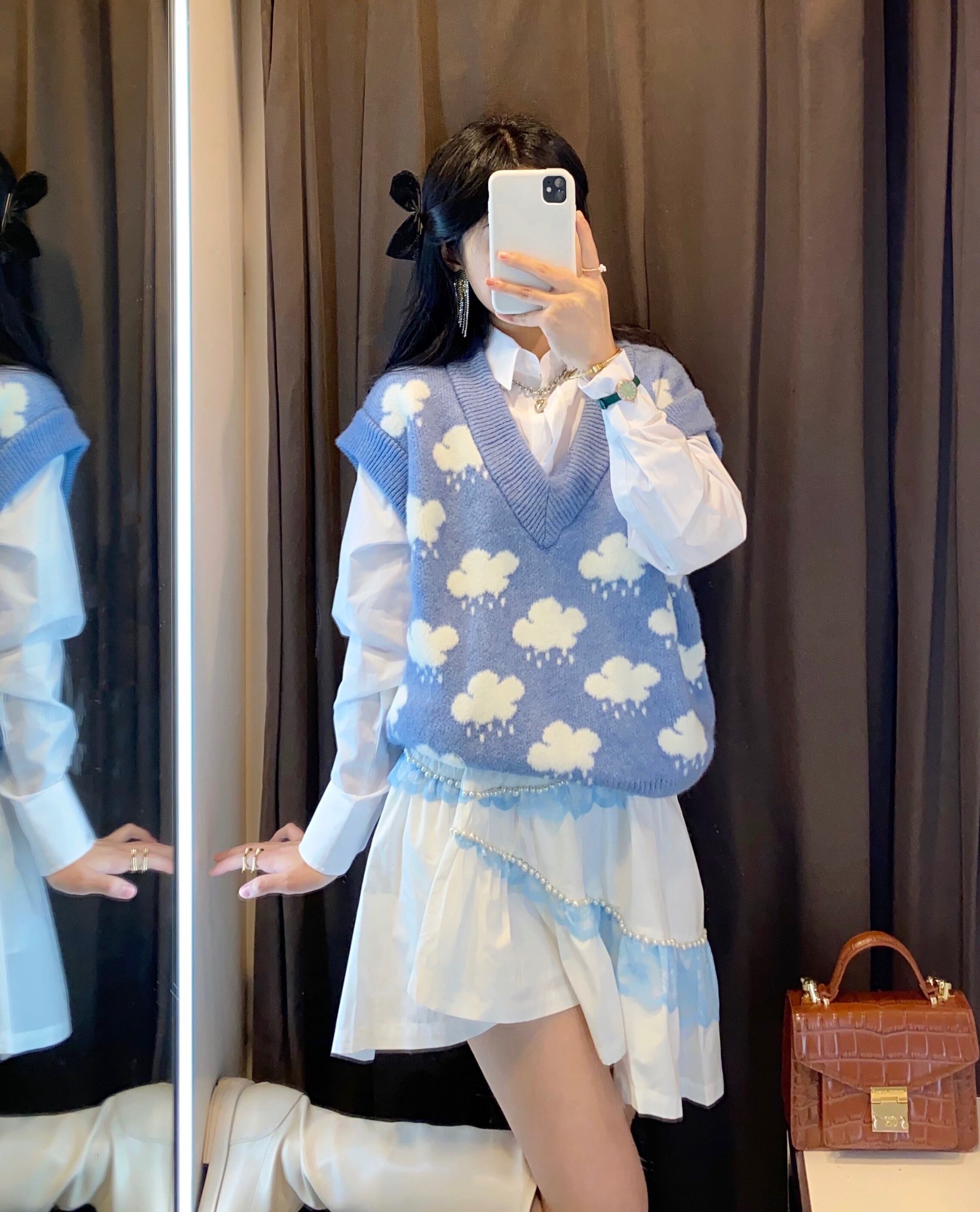 ブルーVネックジャカードニットレディーススプリング秋物ノースリーブセーター 大人ガーリー スウィート キュート カジュアル 春物 オータム ウエスト コーデ Marchs58537650681