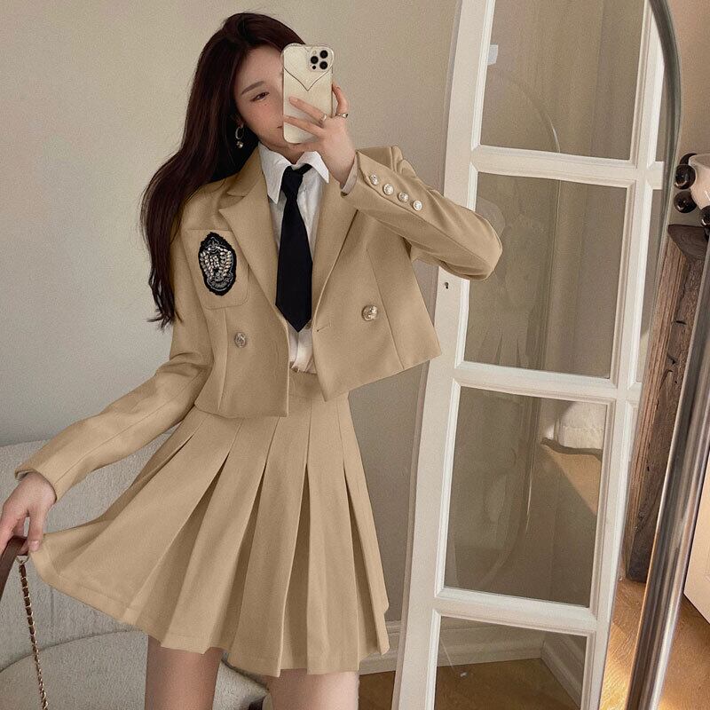 色:アプリコットの白いスーツ,カーキ色のスーツ,黒いスーツ,アプリコットホワイトスカート,カーキ色のスカート,黒スカート,ネクタイ付きシャツ