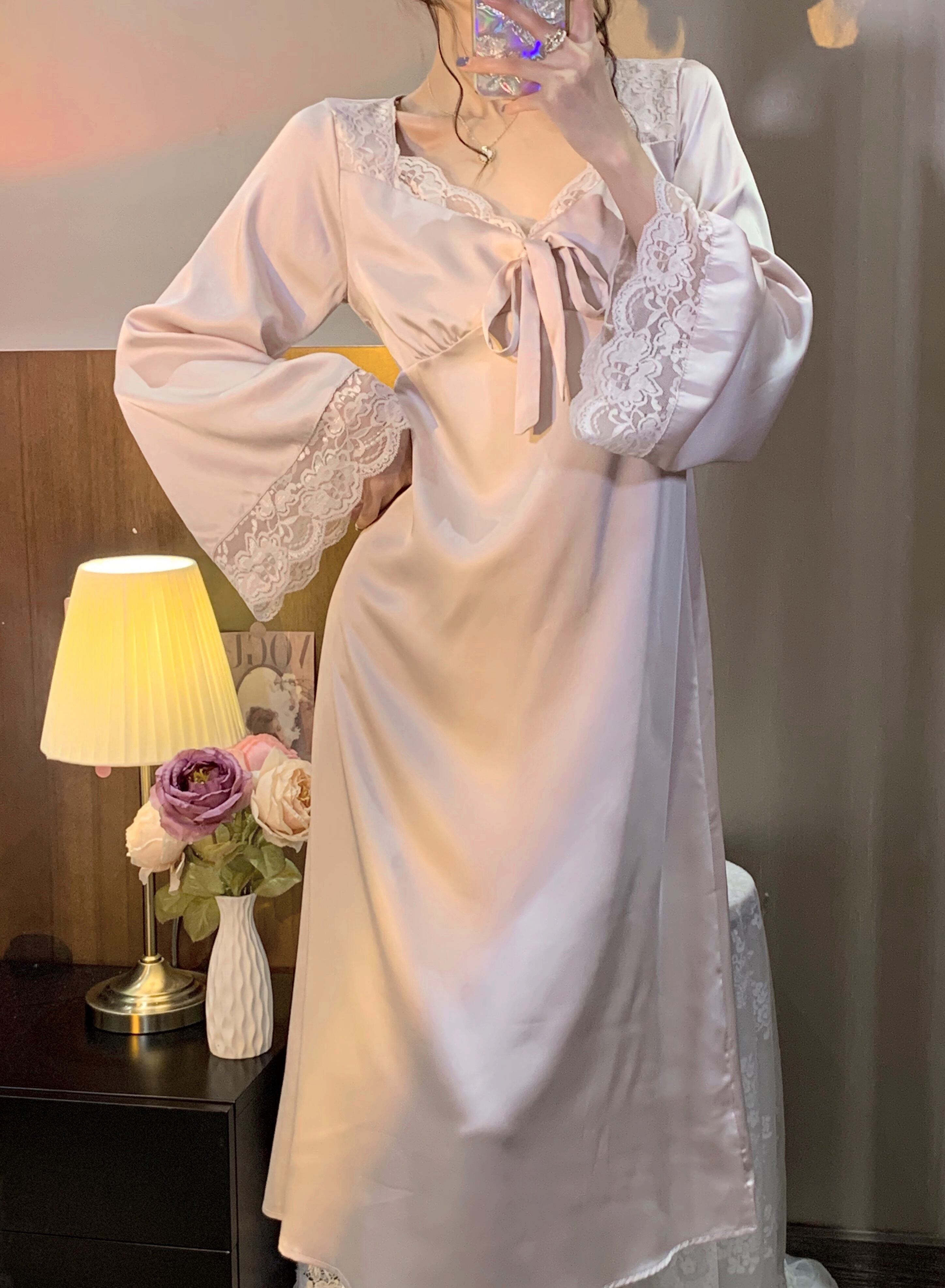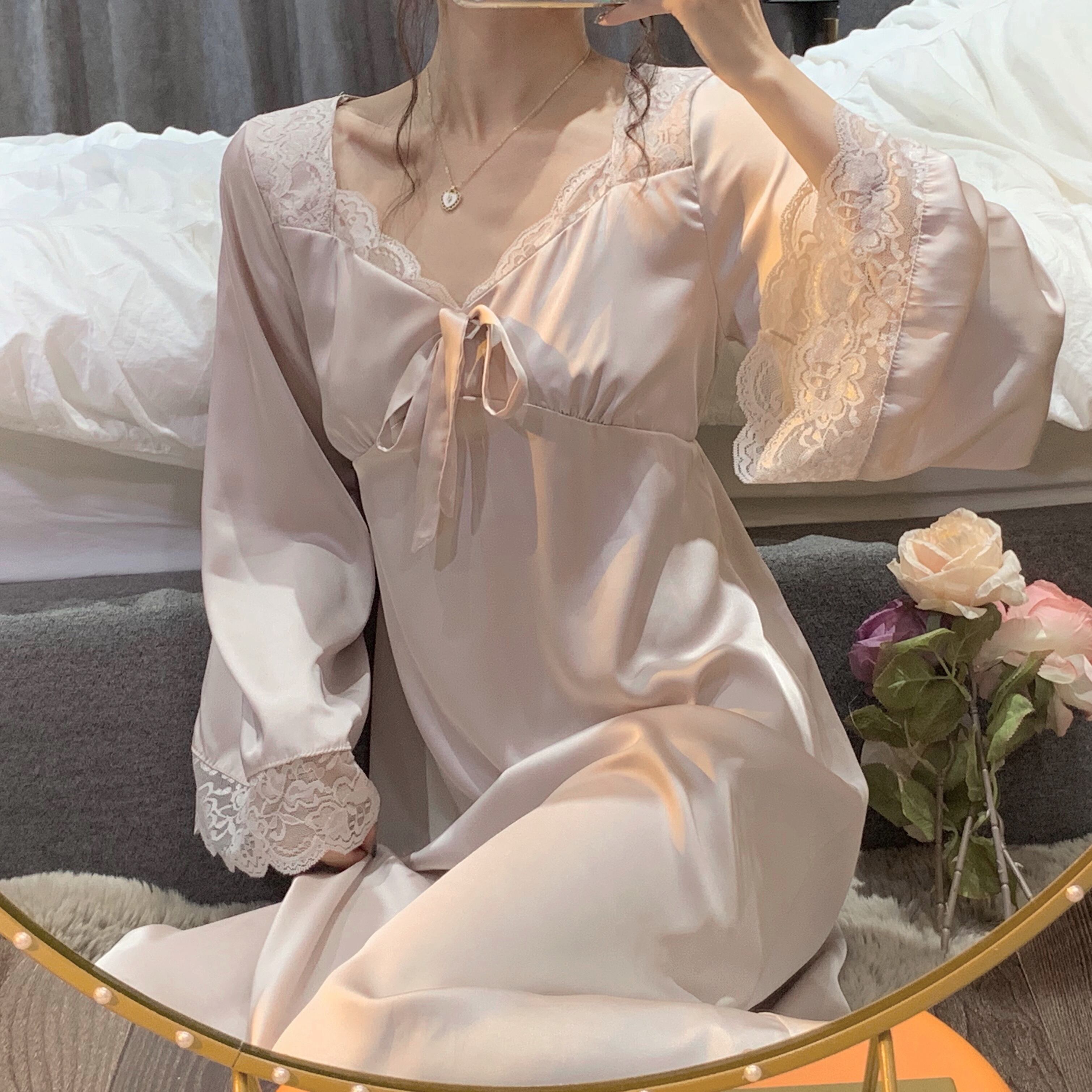 レディーススプリング秋物パジャマ ルームウェアスタイル ロング 春物 オータム シルク ワンピース 長袖 コーデ marchs6715156639543
