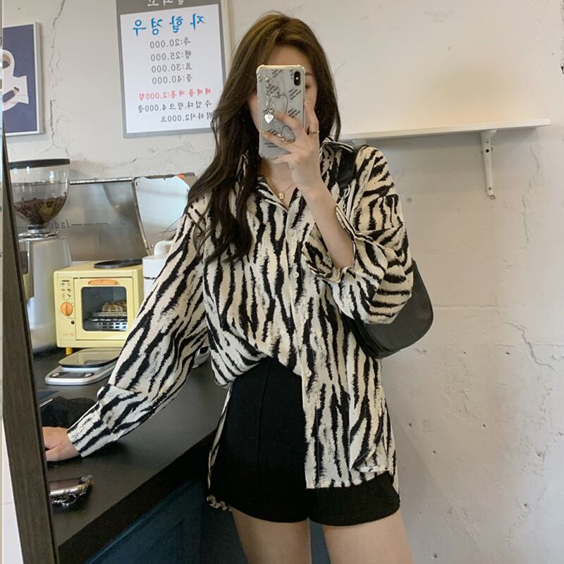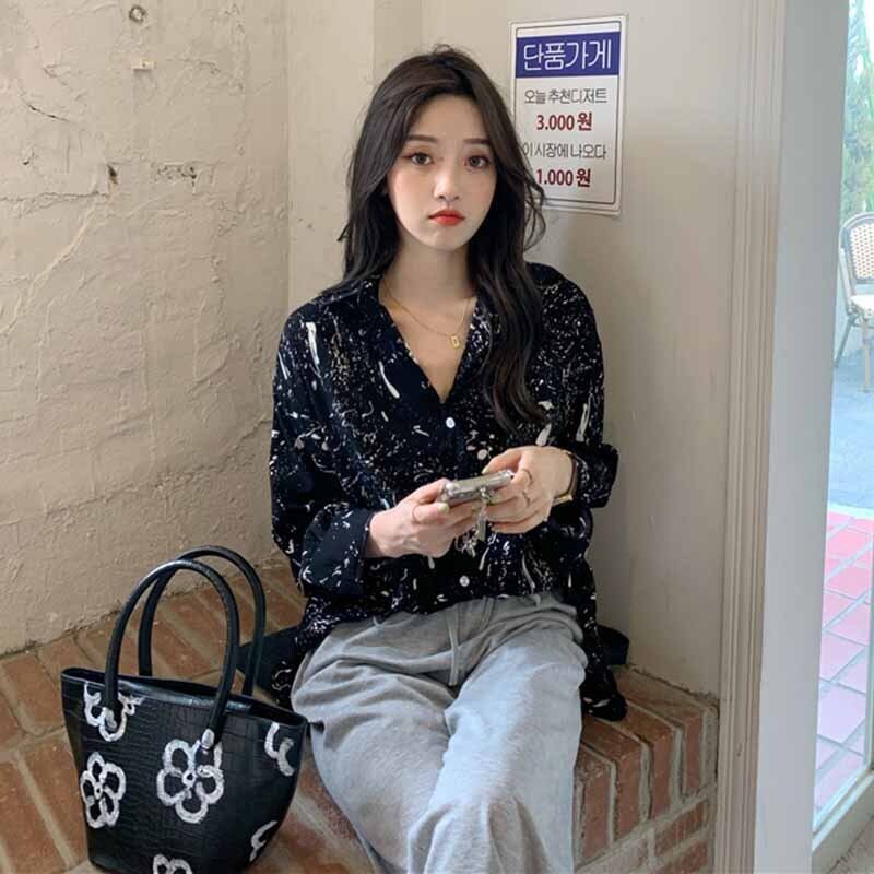 スタイルプリント柄シャツ スタンダードルーズジャケット ロング レトロ 長袖 コーデ marchs6751496182478
