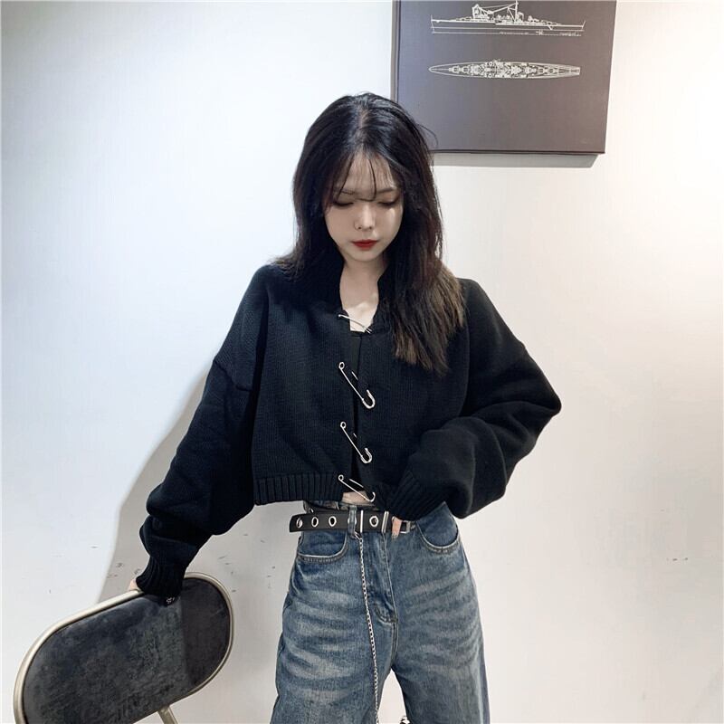ブラックセーター カーディガンジャケット レディーススタンダードスプリング秋物ルーズショートニットトップス レトロ 春物 オータム コーデ Marchs7092889491