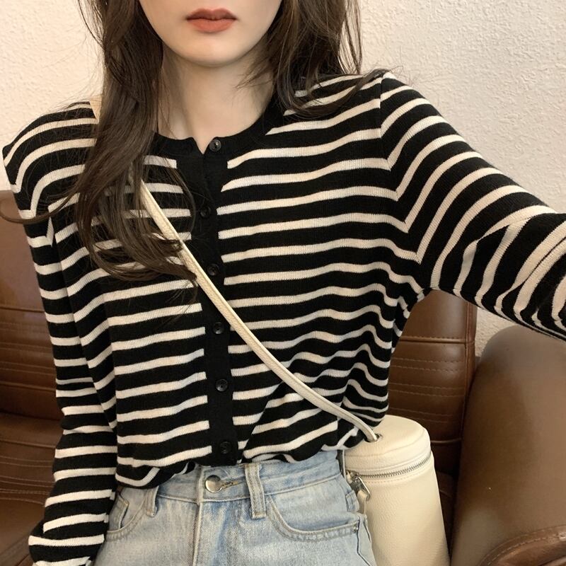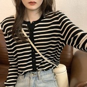 ストライプニットカーディガンスプリング秋物韓国ファッションスタイル薄手セーター ジャケット トップス ロング 春物 オータム 長袖 コーデ Marchs78221686667