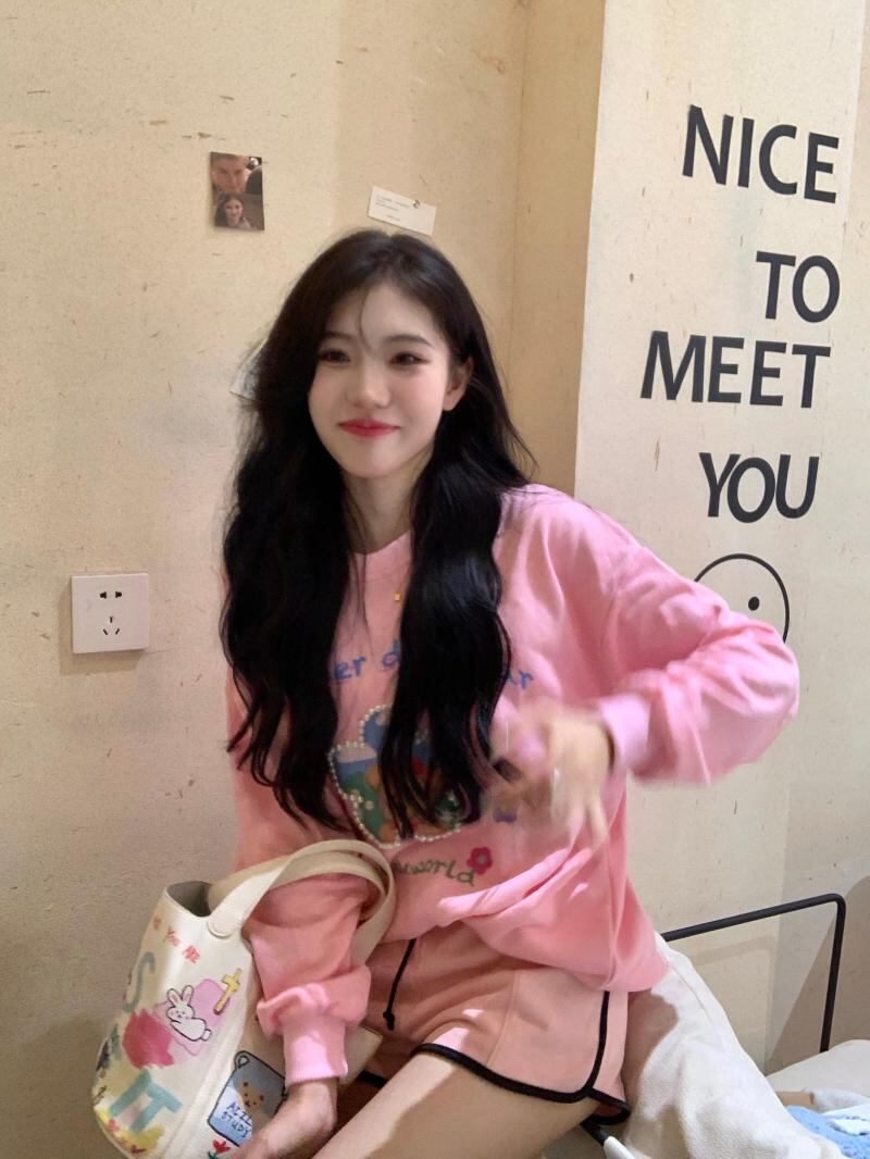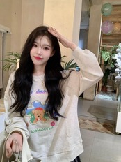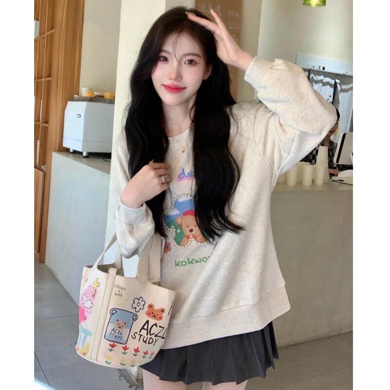 スプリング秋物韓国ファッションパールプリント柄ルーズラウンドネック コットン 春物 オータム Oネック 真珠 コーデ marchs6763358133879