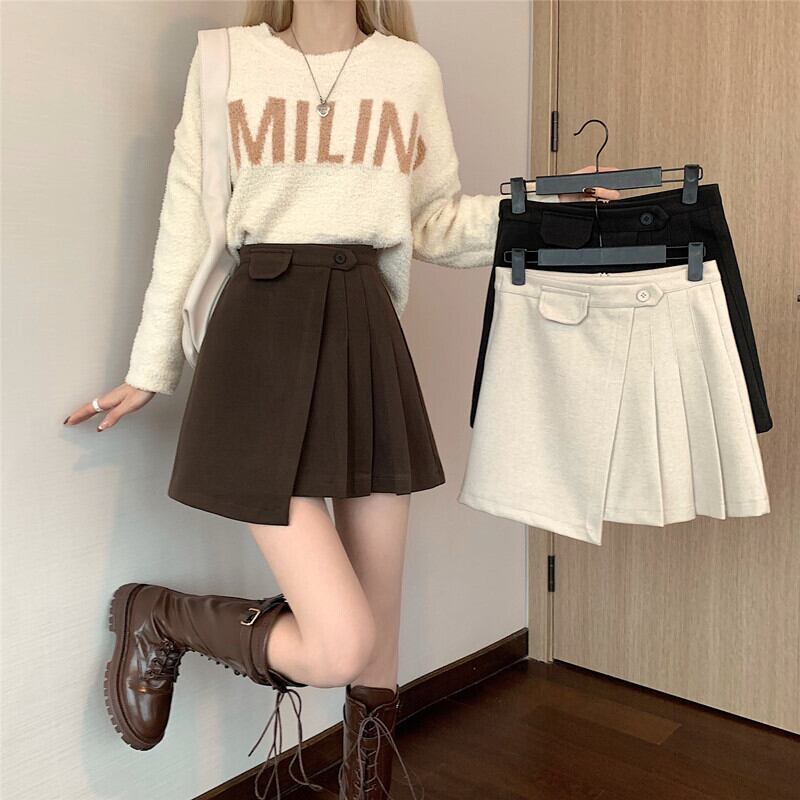 ブラウンプリーツスカート 秋物ウィンターハイウェストウェストAラインレディースショート オータム 冬物 ウエスト コーデ Marchs89222325326