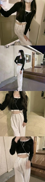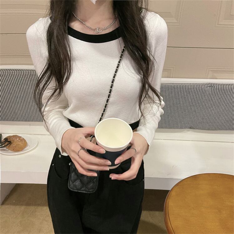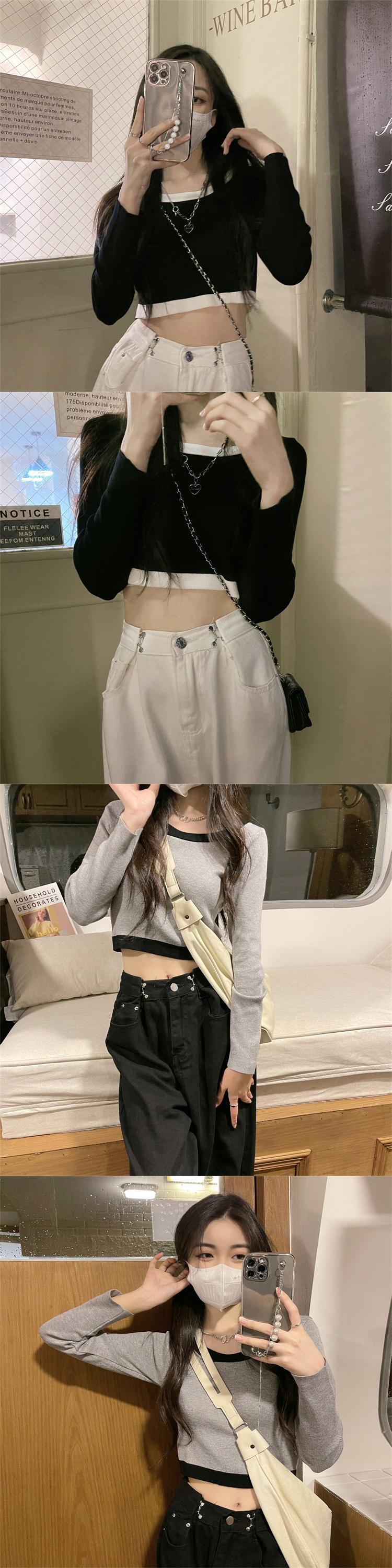 ブラックニットゆったりシャツ 秋物ウィンターカラーラウンドネックTシャツスリムクロップドトップス ロング オータム 冬物 Oネック 長袖 コーデ Marchs18789404307