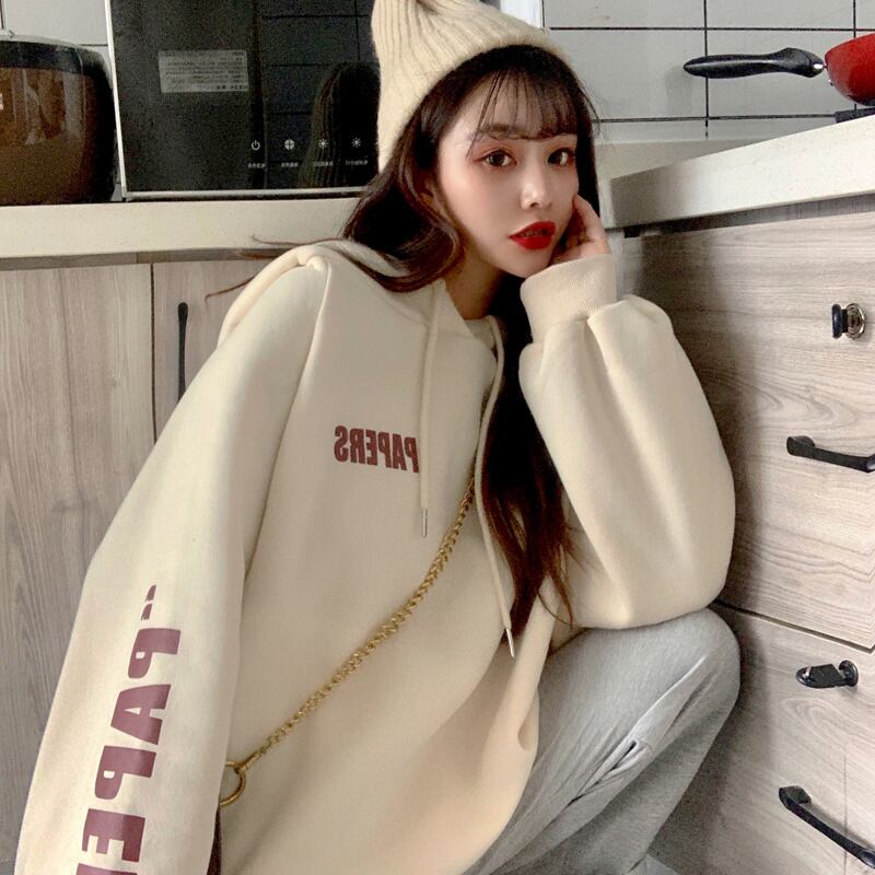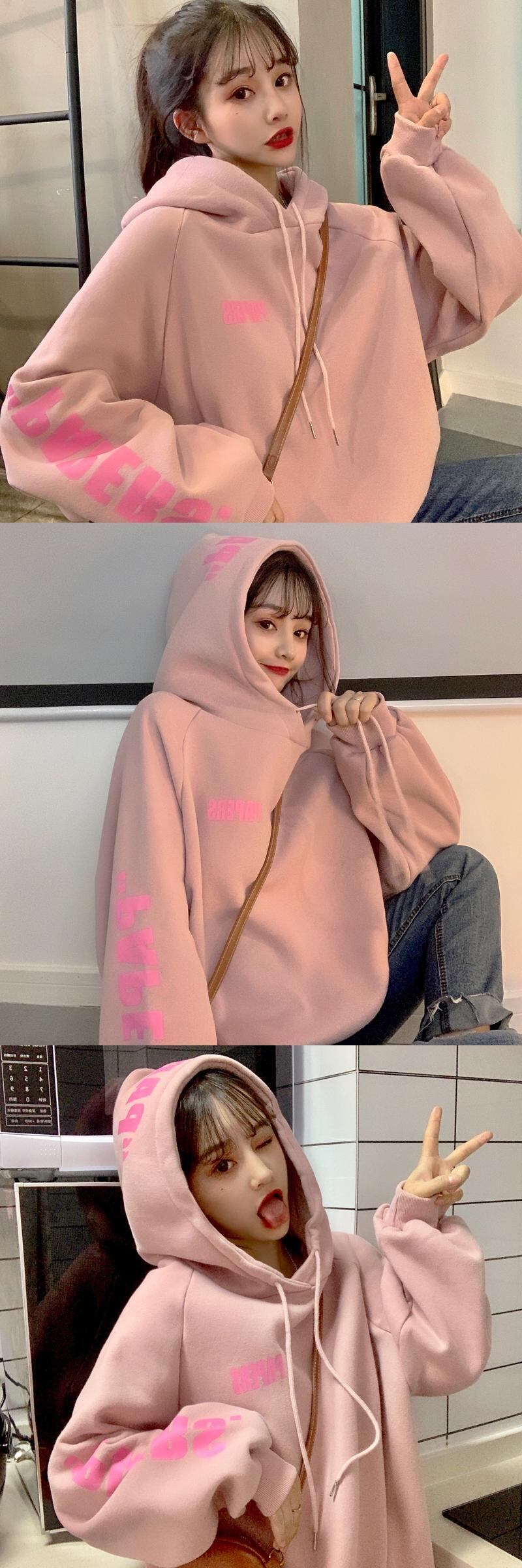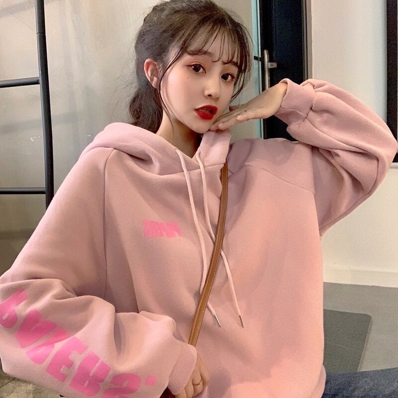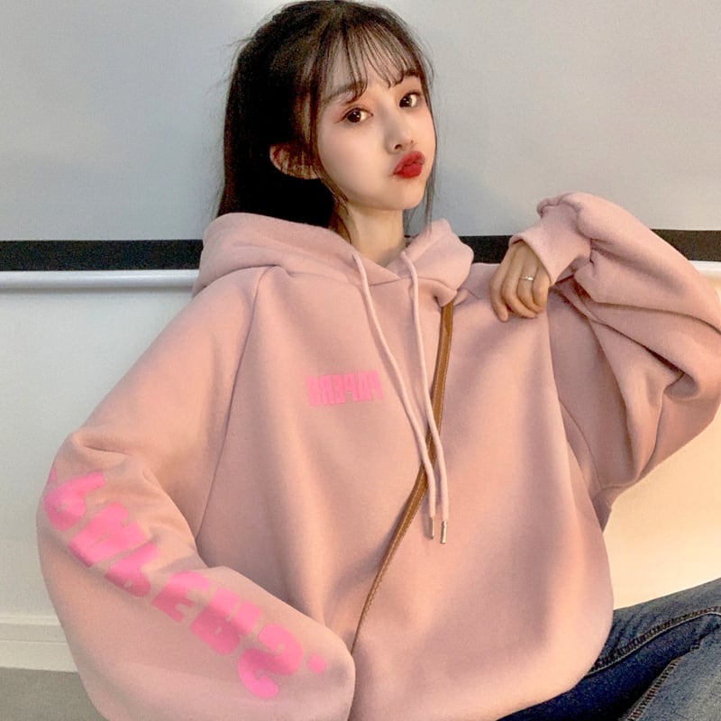 スプリング秋物韓国ファッションフード厚みセーター ルーズプリントプルオーバー ジャケット ウィンター ピンク 春物 オータム 冬物 スタイル コーデ marchs6735404882460