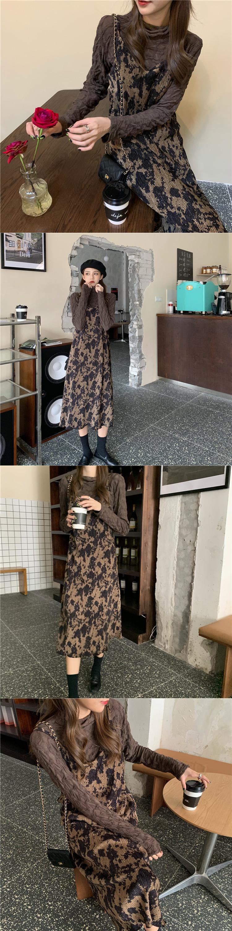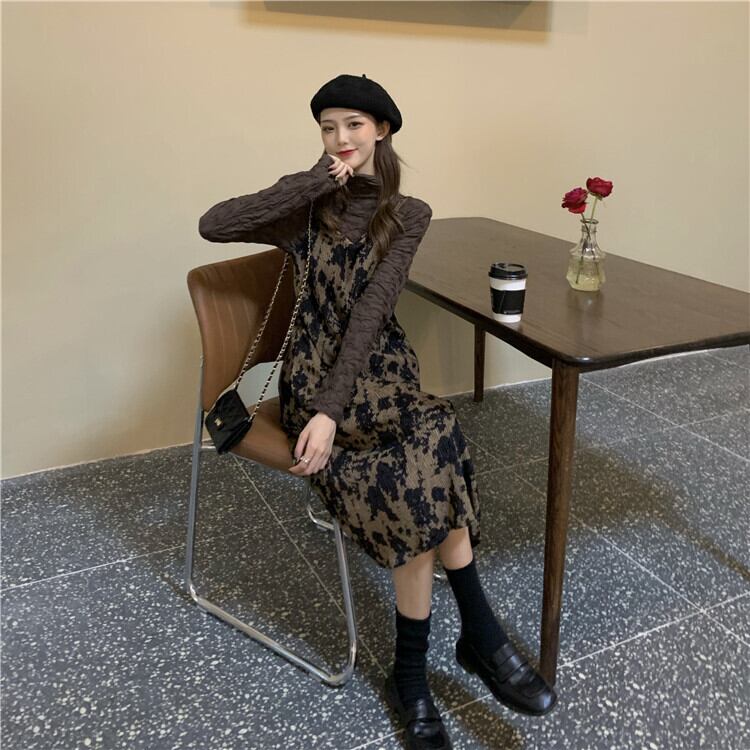 色:黒底シャツ,コーヒー色のボトミングシャツ,ブラックサスペンダースカート,コーヒーカラーサスペンダースカート