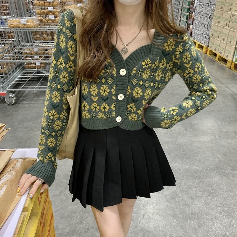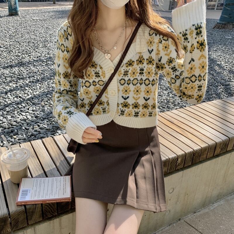 秋物ウィンターNEWフローラルカラーショートニットカーディガンスタイルセーター コート レディース オータム 冬物 花柄 スクウェア コーデ Marchs96842079391