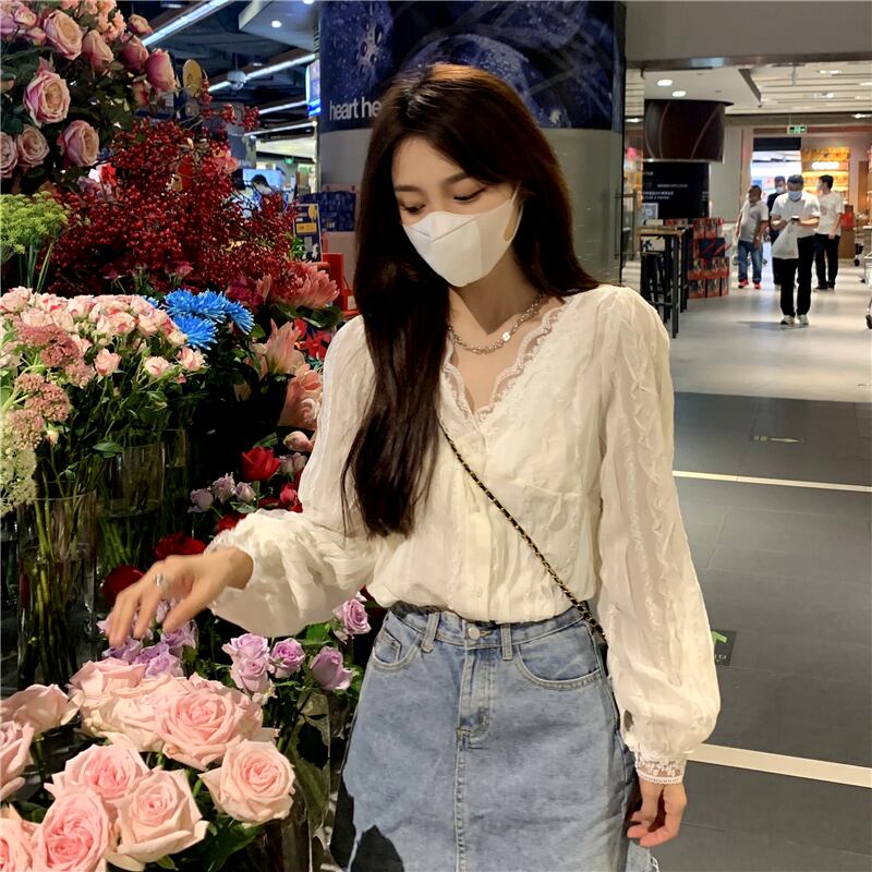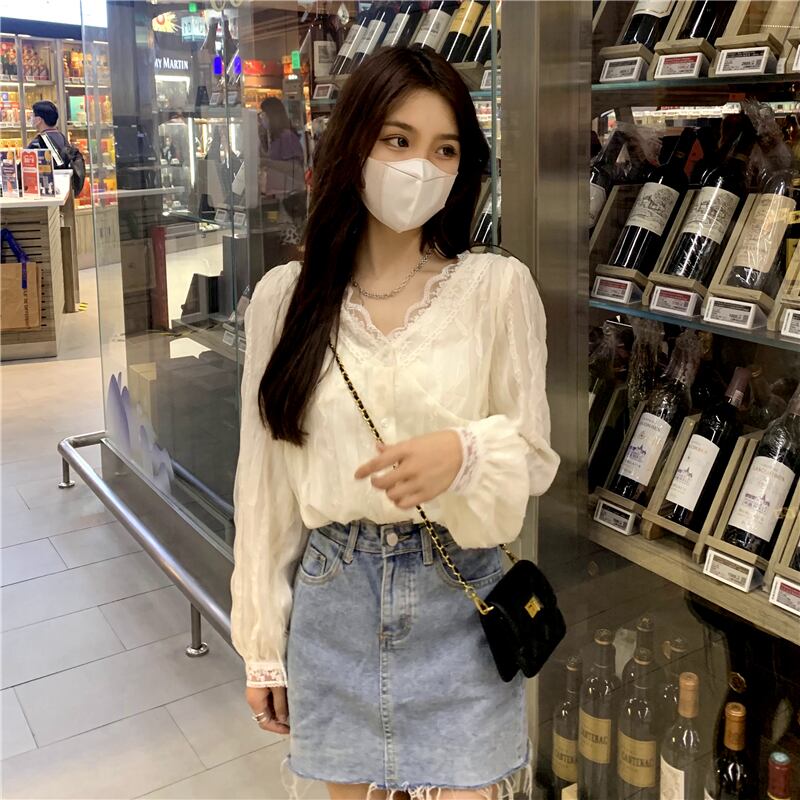 秋物韓国ファッションスタイルブラウス レースVネックシャツ ロング 大人ガーリー スウィート キュート カジュアル オータム 長袖 コーデ Marchs85543255019