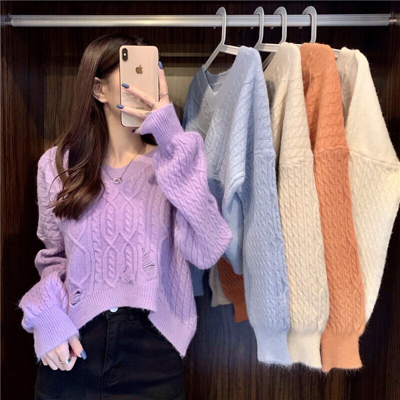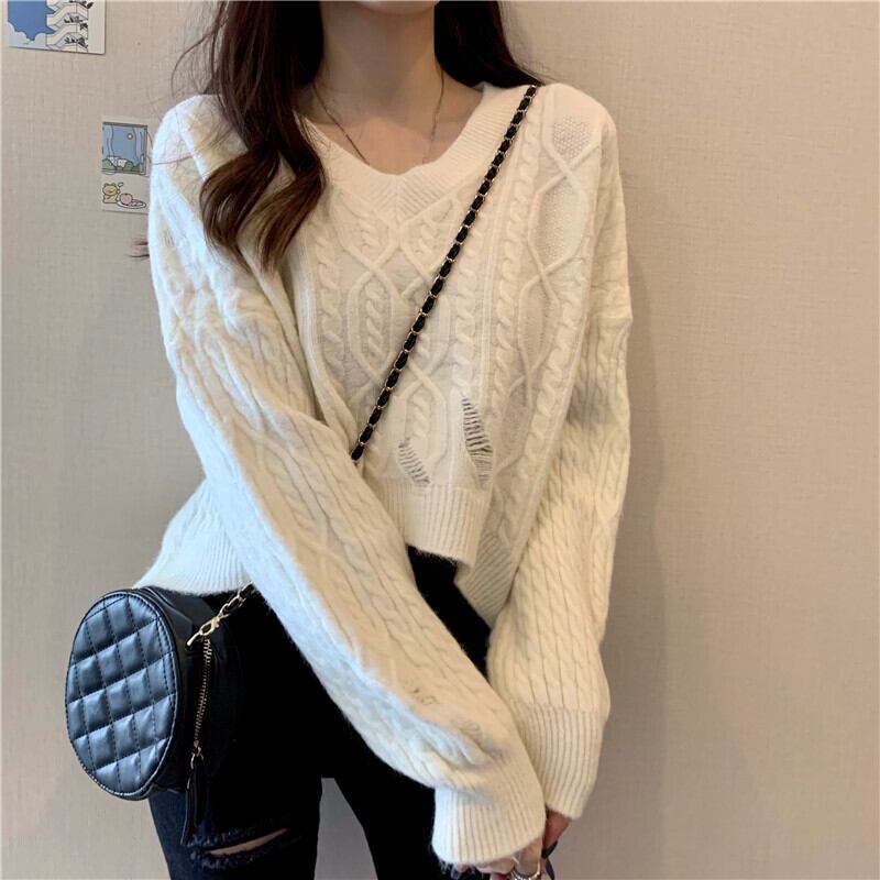 Vネックホワイトプルオーバー セーター 秋物ウィンタールーズショートニットトップス オータム 冬物 コーデ Marchs68899344318