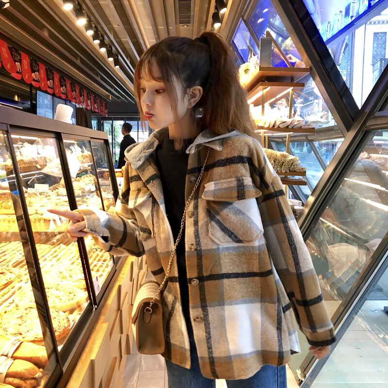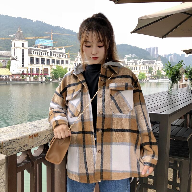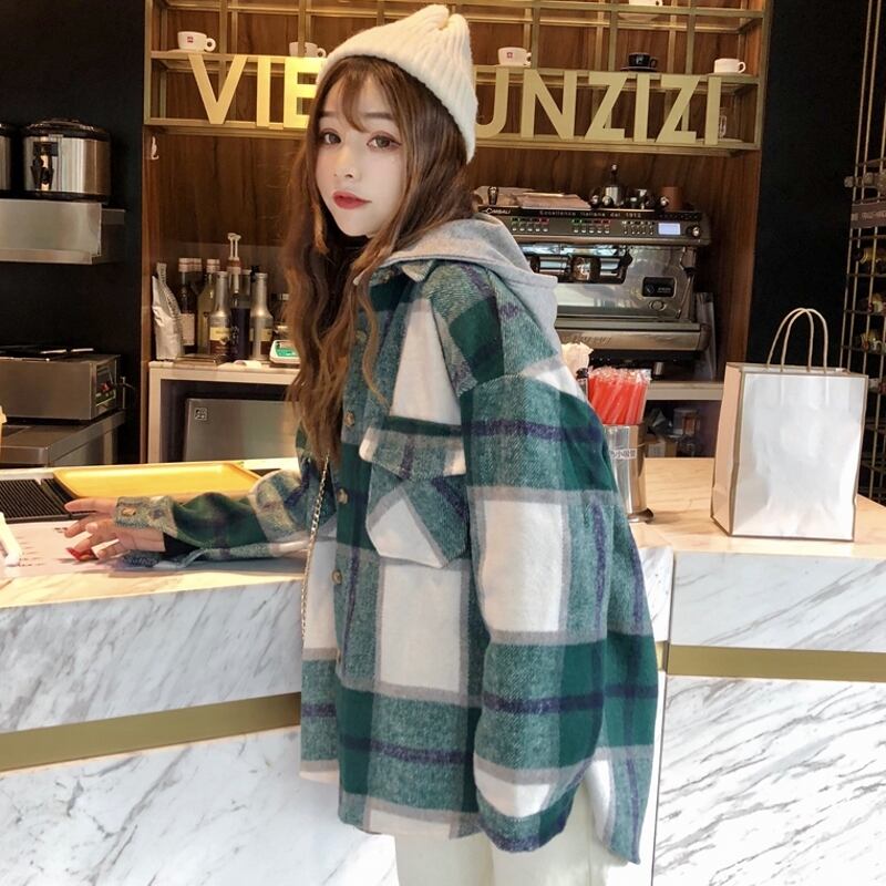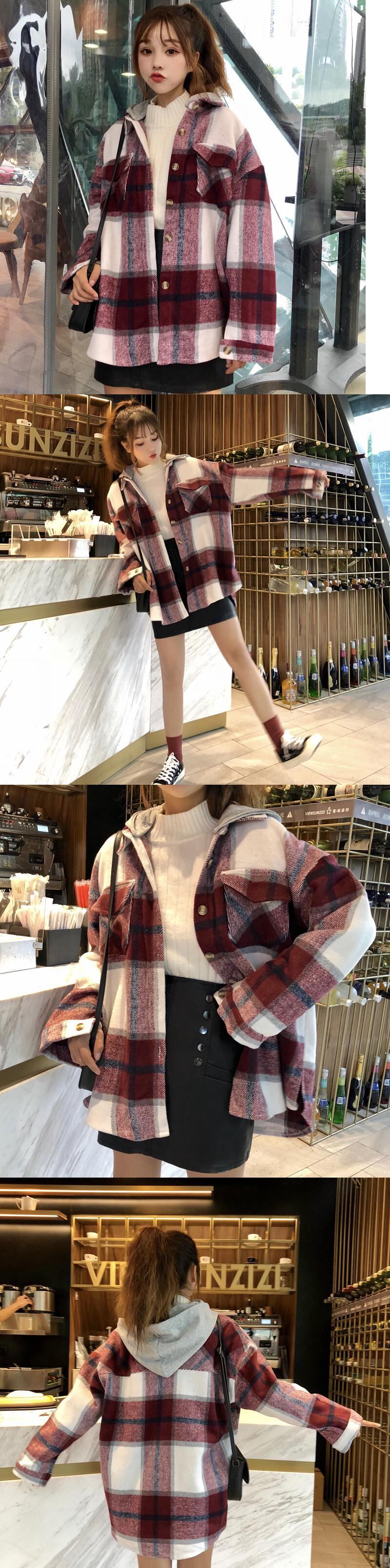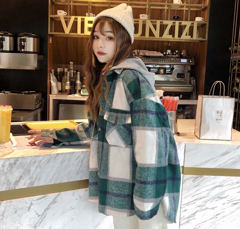 スプリング秋物韓国ファッションルーズ格子柄フードショートジャケット レディース ロング 春物 オータム スタイル 長袖 コーデ Marchs1406200023