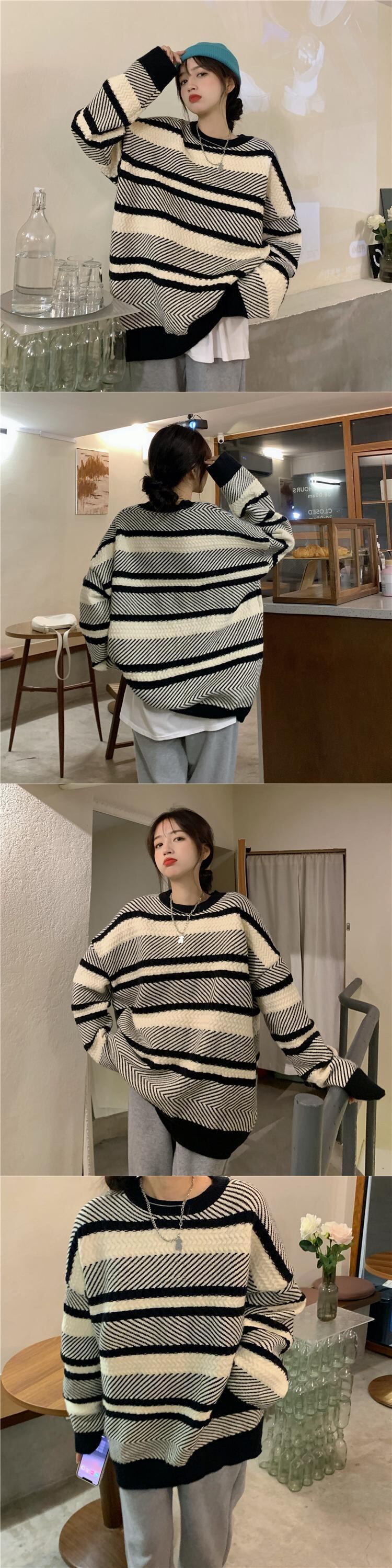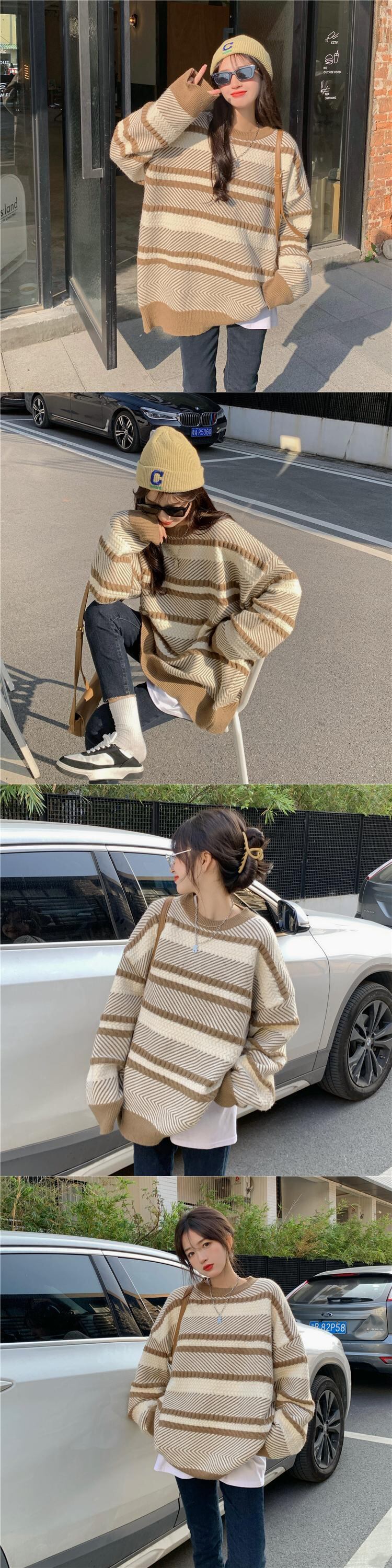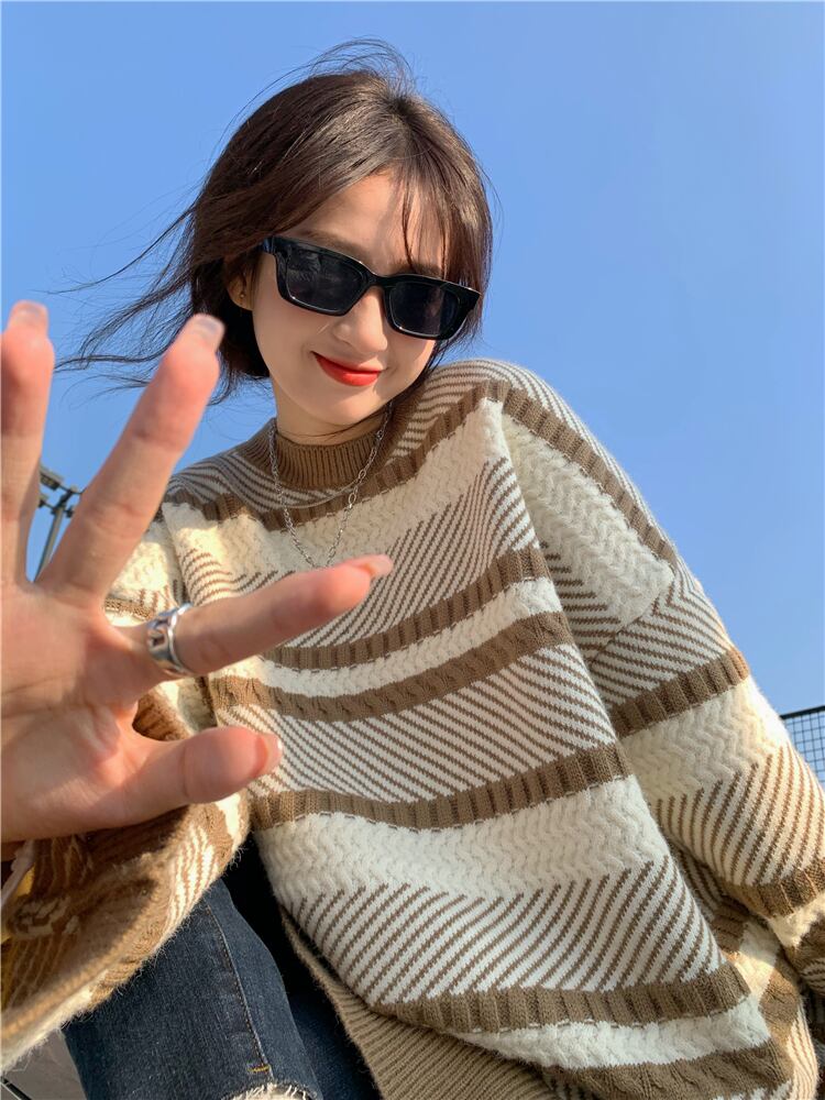 ストライプセーター レディース秋物ウィンタールーズスタイルプルオーバー ニットトップス オータム 冬物 ミドル丈 コーデ Marchs79185121464