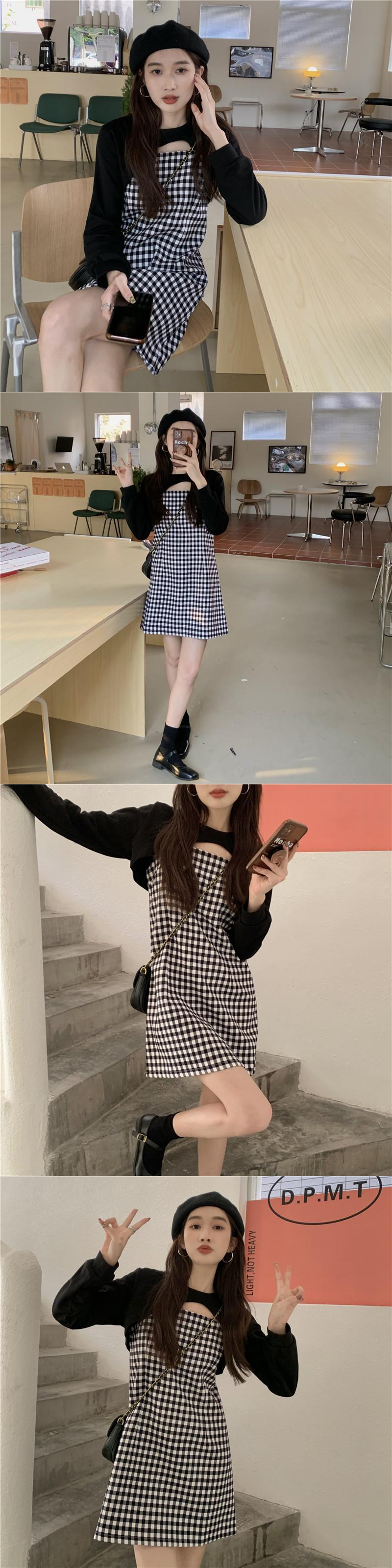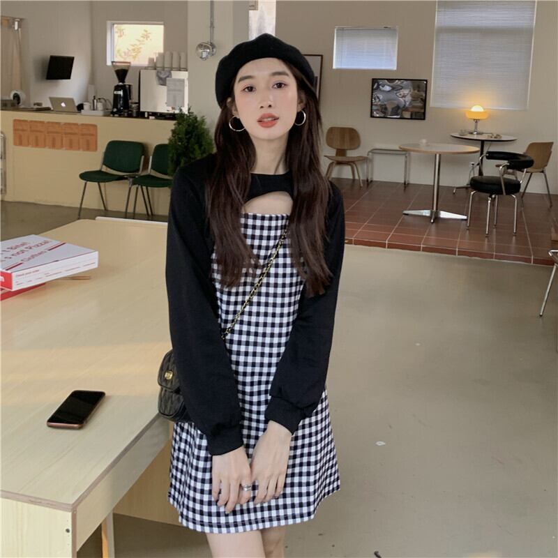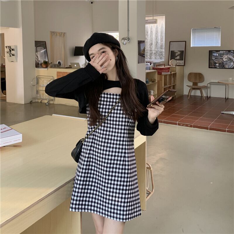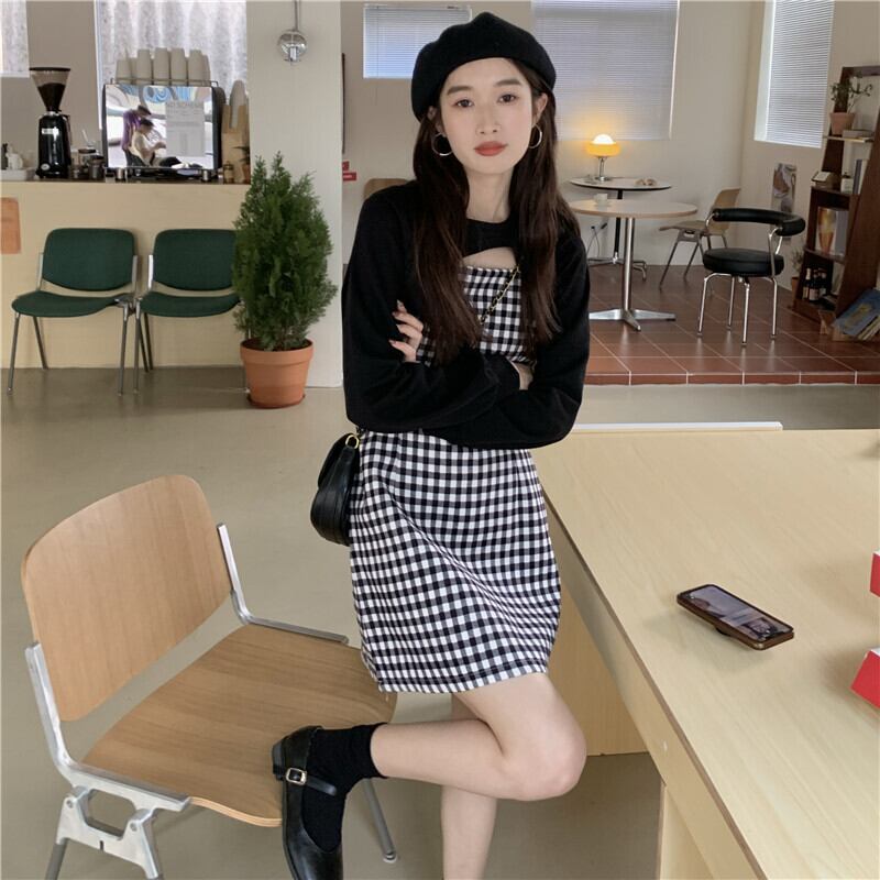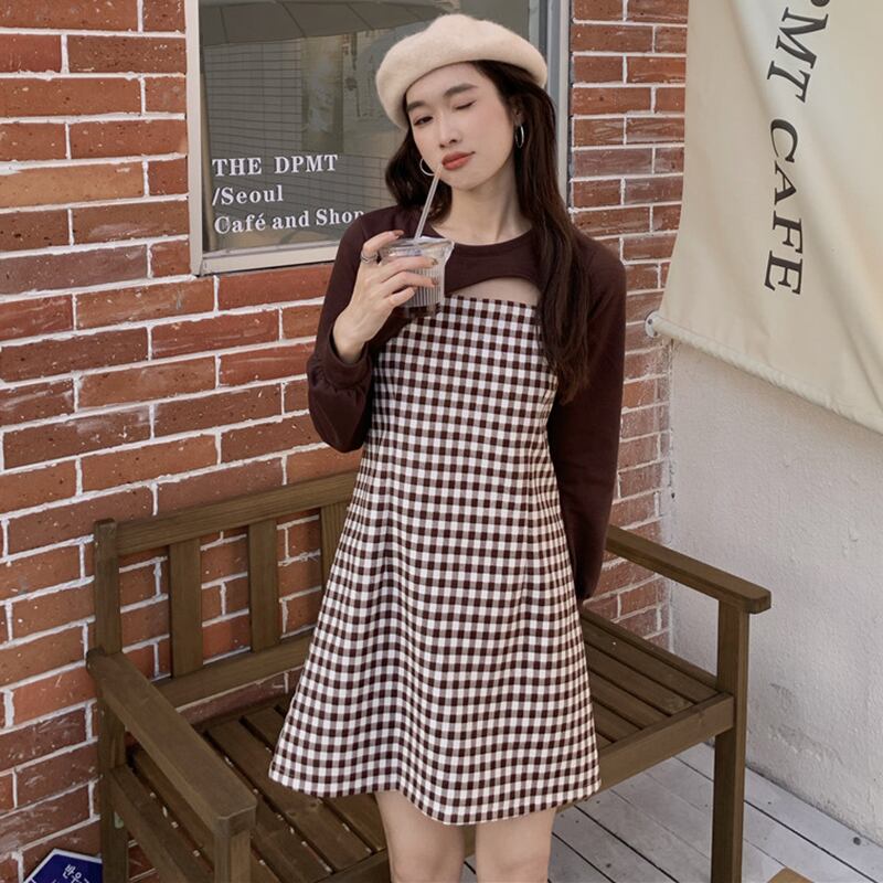 色:ブラックトップ+ブラックチェックスカート,コーヒーカラートップ+コーヒーカラーチェック柄スカート