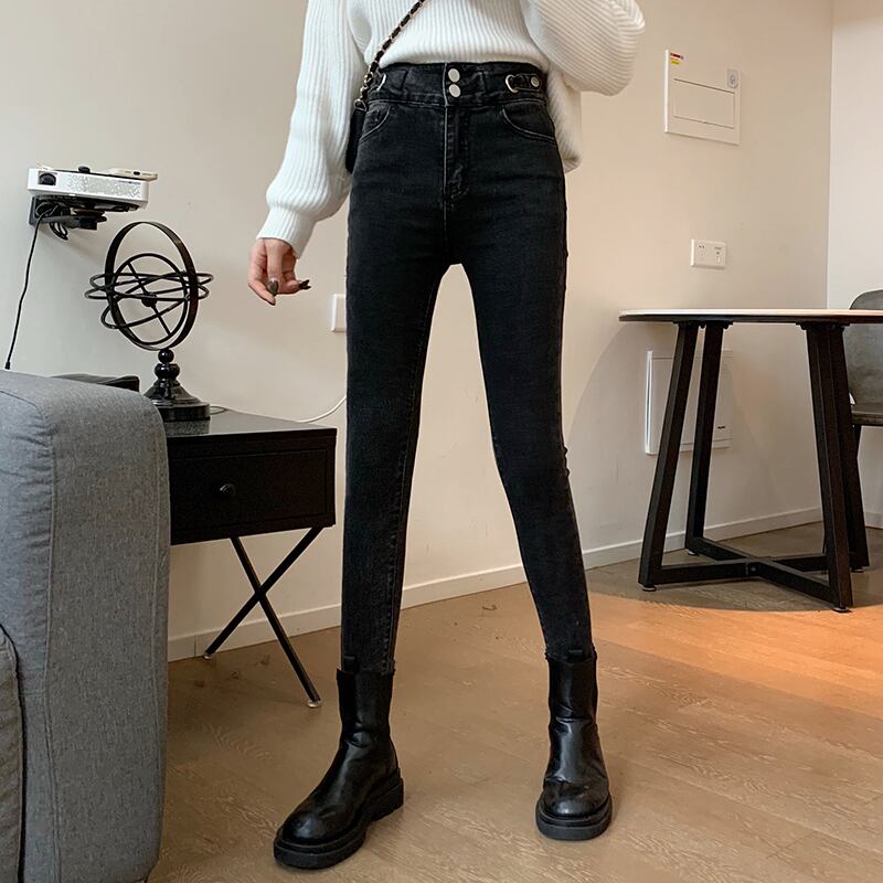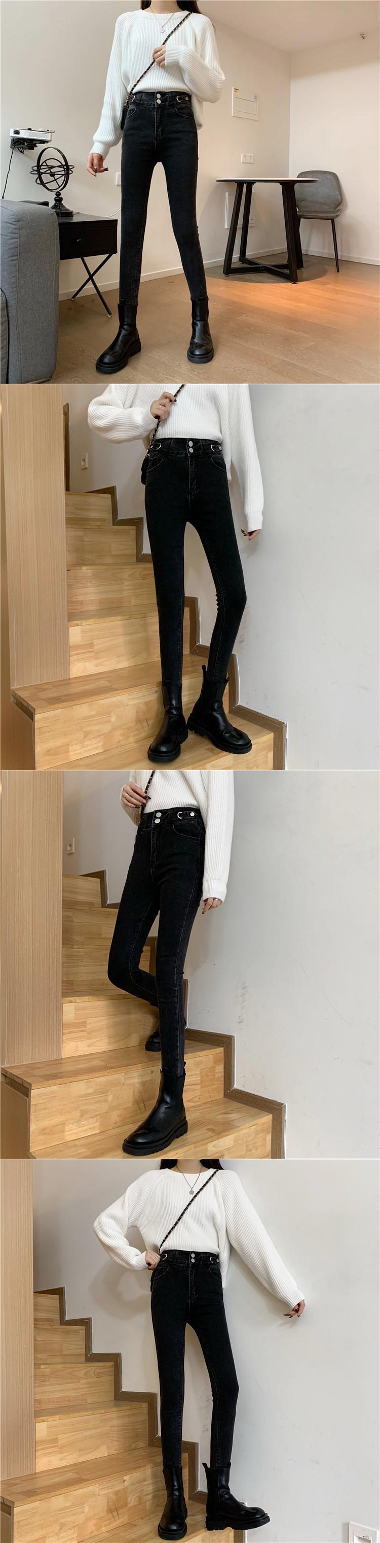 ブラックハイウェスト厚みジーンズ 秋物ウィンターパンツ 薄手 オータム 冬物 ウエスト コーデ Marchs22384376634