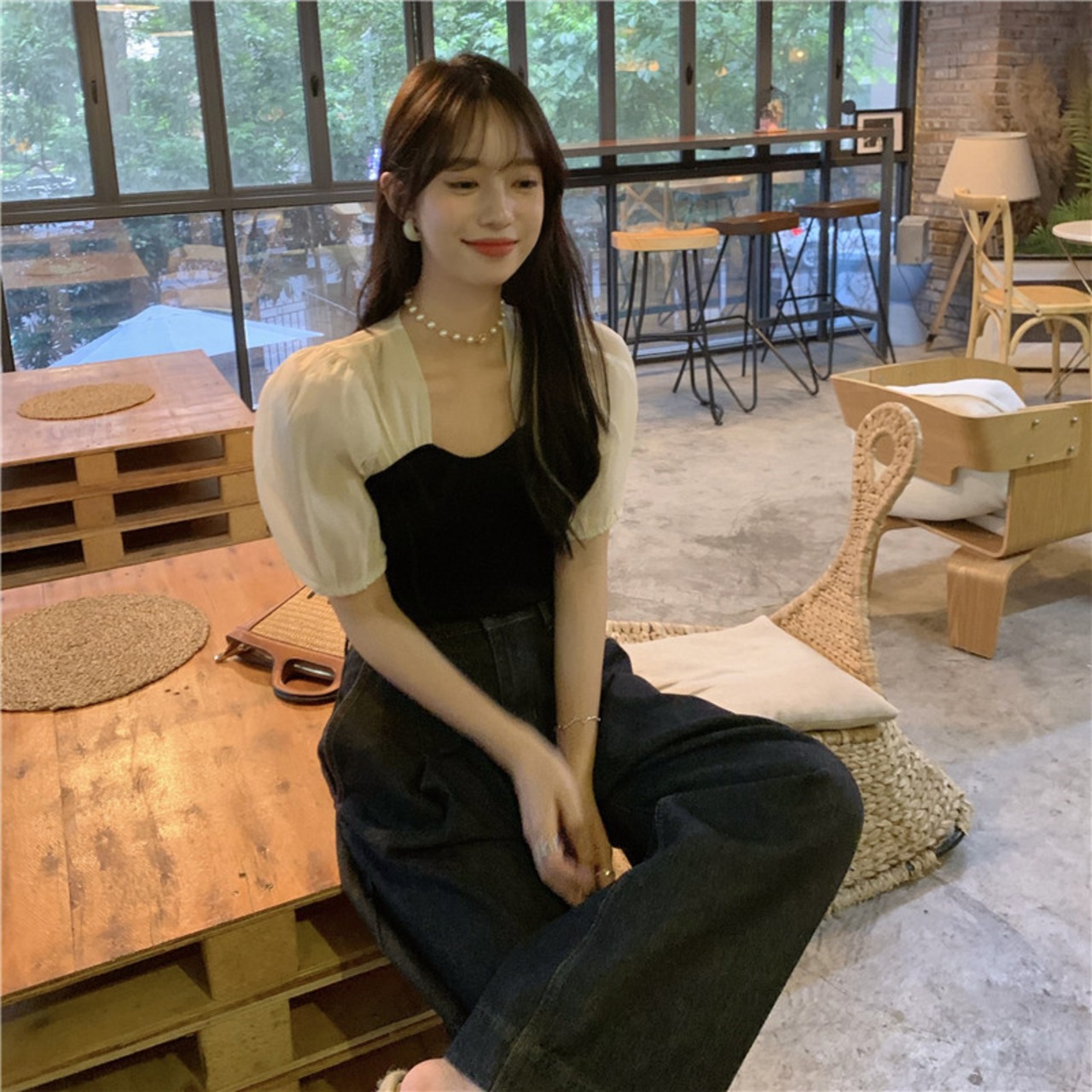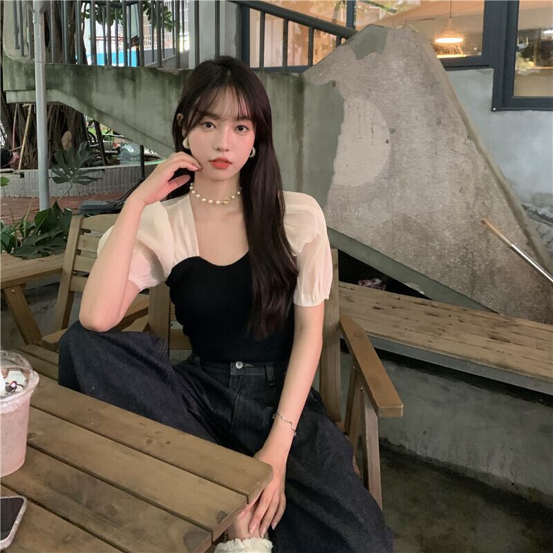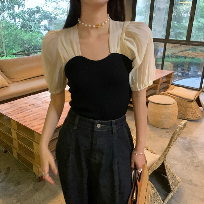 スリーブカラーシャツ レディース夏服スタンダードセーター 半袖トップス ショート レトロ ハーフスリーブ 夏物 スクウェア ステッチ コーデ marchs677459745900