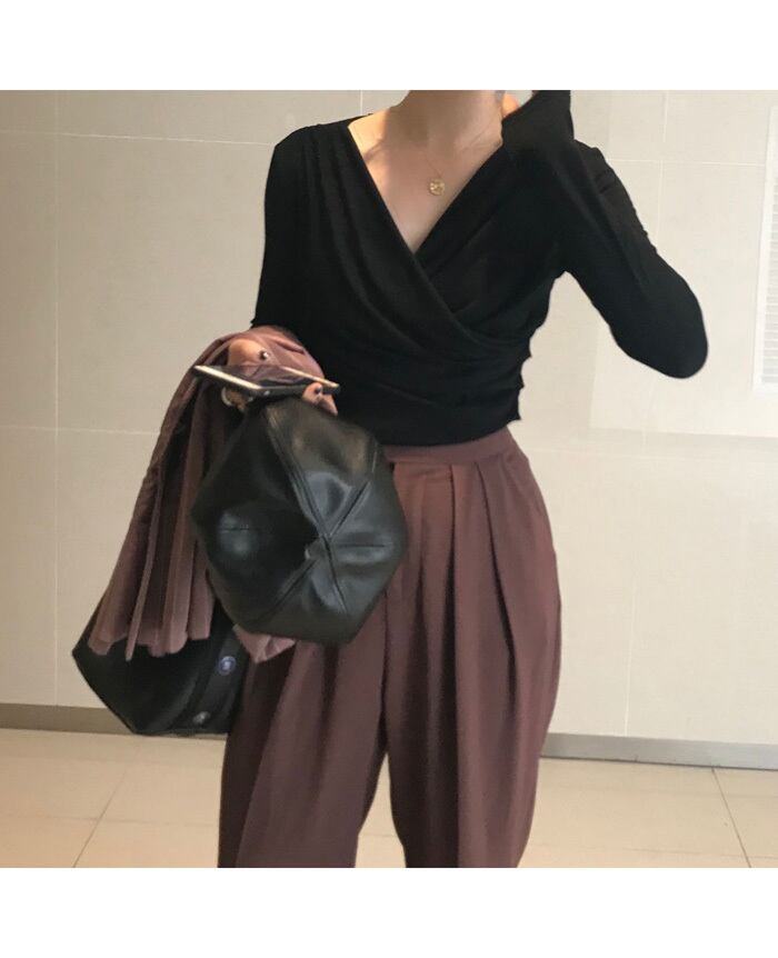 クロスVネックウェストTシャツシャツ 秋物ウィンターニットゆったりショートトップス ロング オータム 冬物 長袖 ウエスト コーデ Marchs25949793293