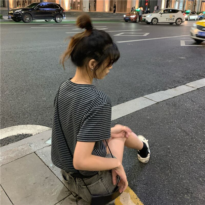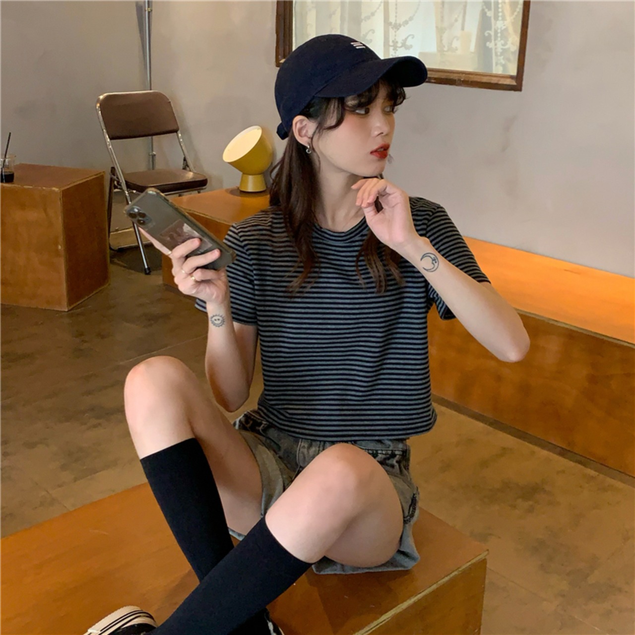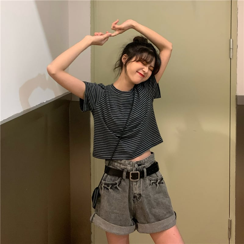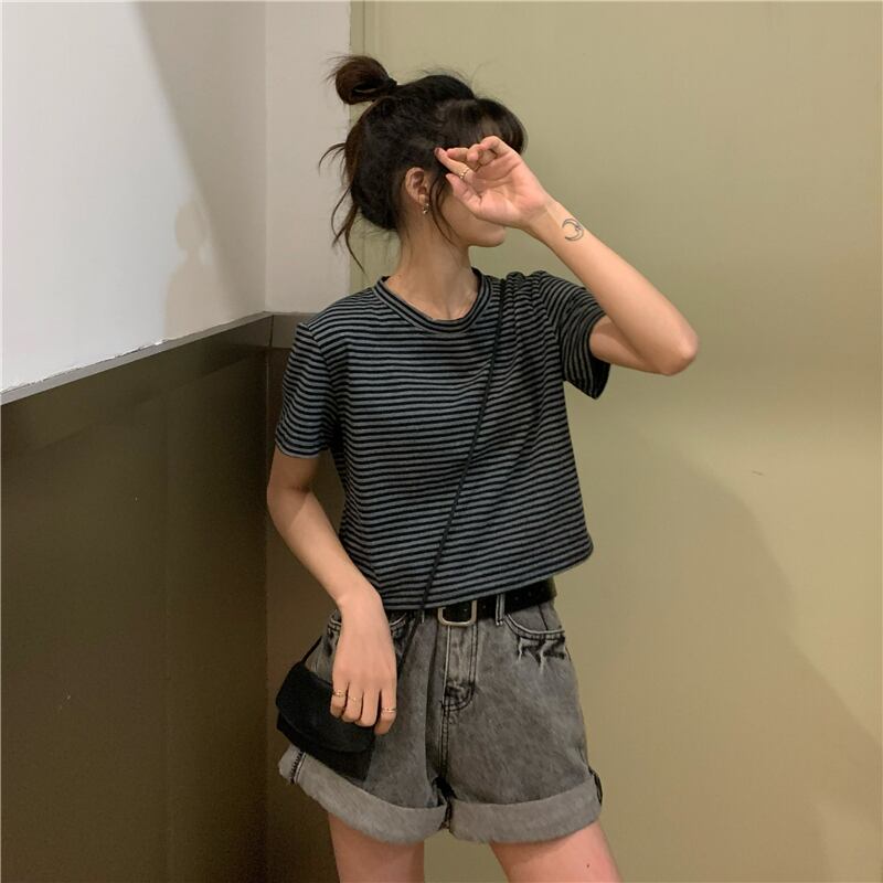 ストライプショートTシャツ夏服韓国ファッションハイウェストスリムフィットトップス NEW 夏物 スタイル ウエスト コーデ Marchs2133185564