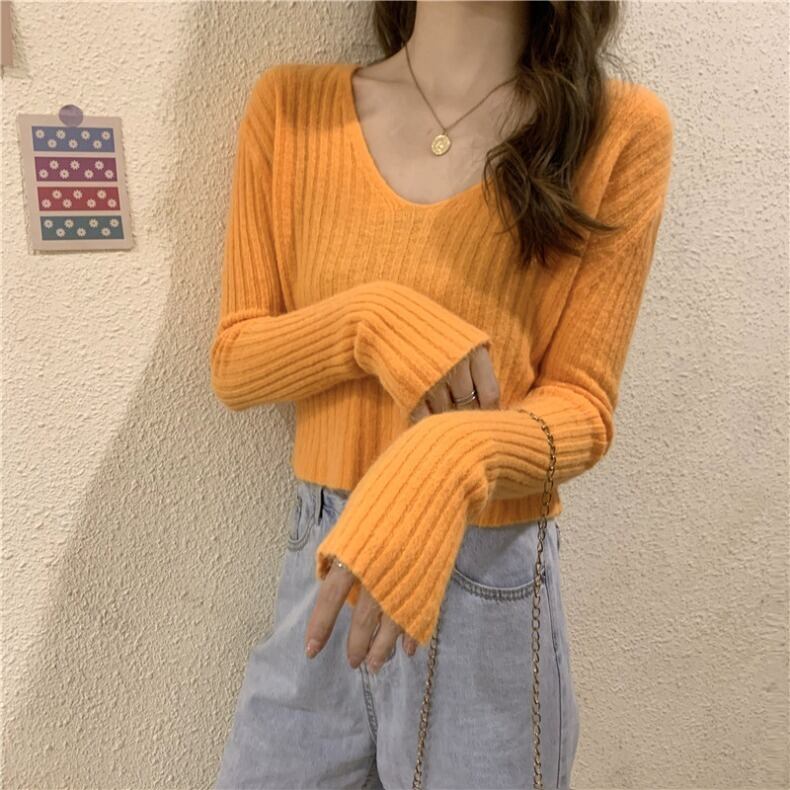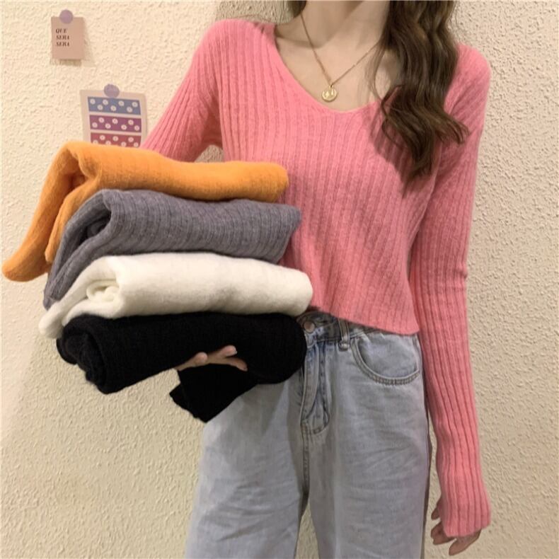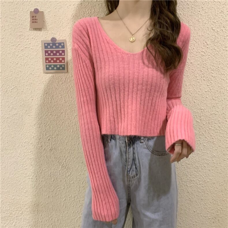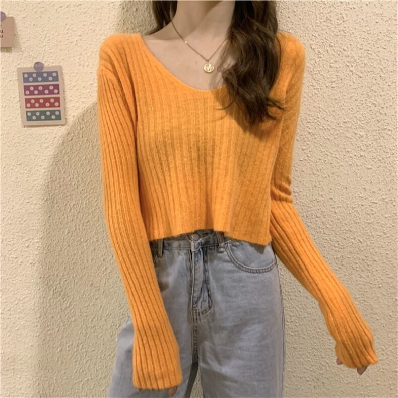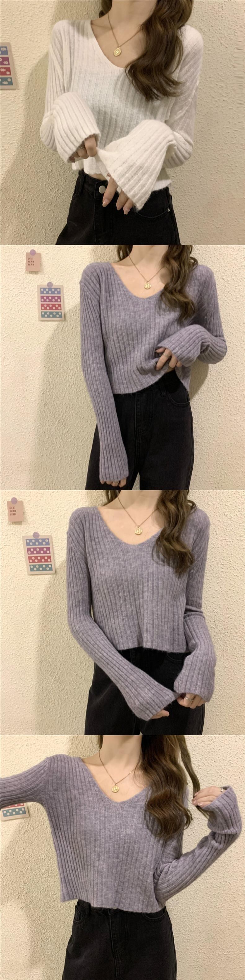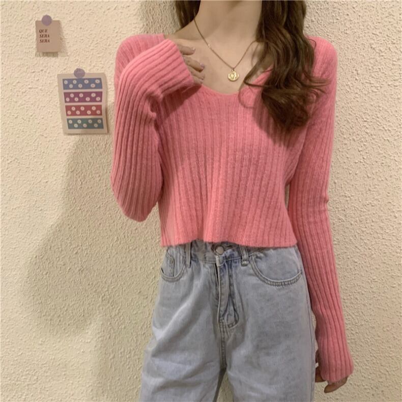 秋物ニットゆったりシャツ ルーズショートトップス ロング オータム Vネック 長袖 コーデ Marchs98086025840