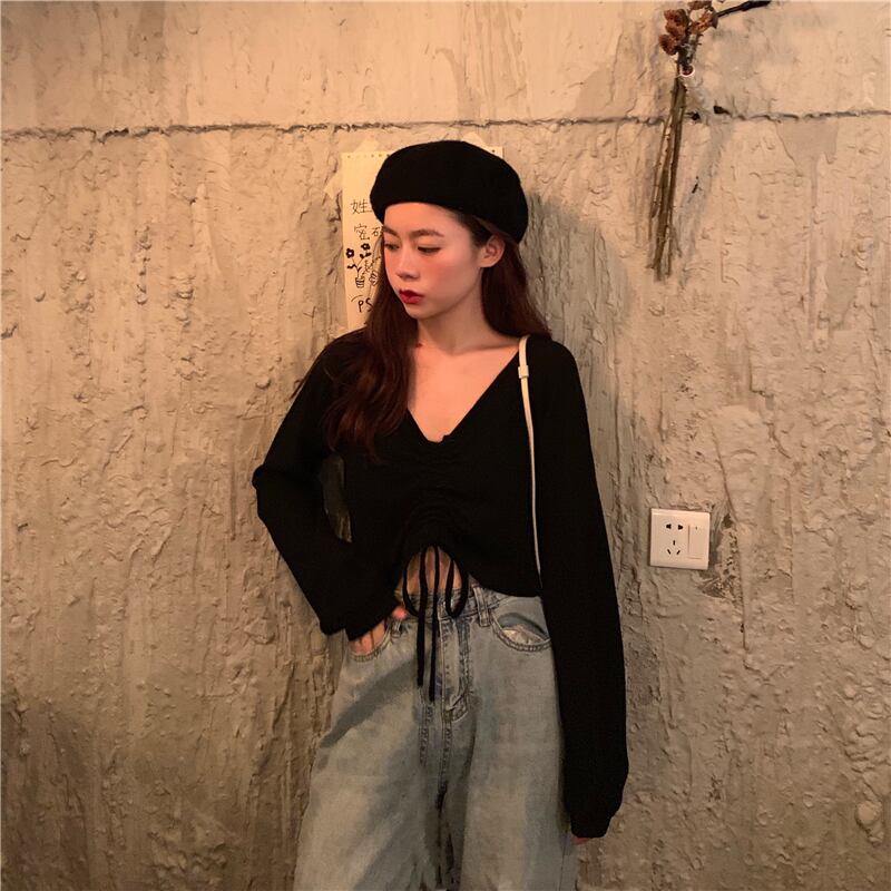 トップス 秋物韓国ファッションスリムVネックニットショートTシャツ ロング オータム スタイル 長袖 コーデ Marchs84010331146