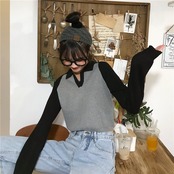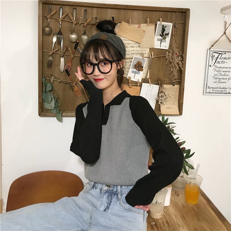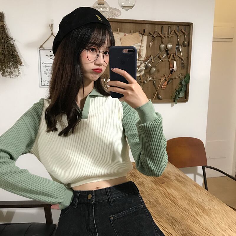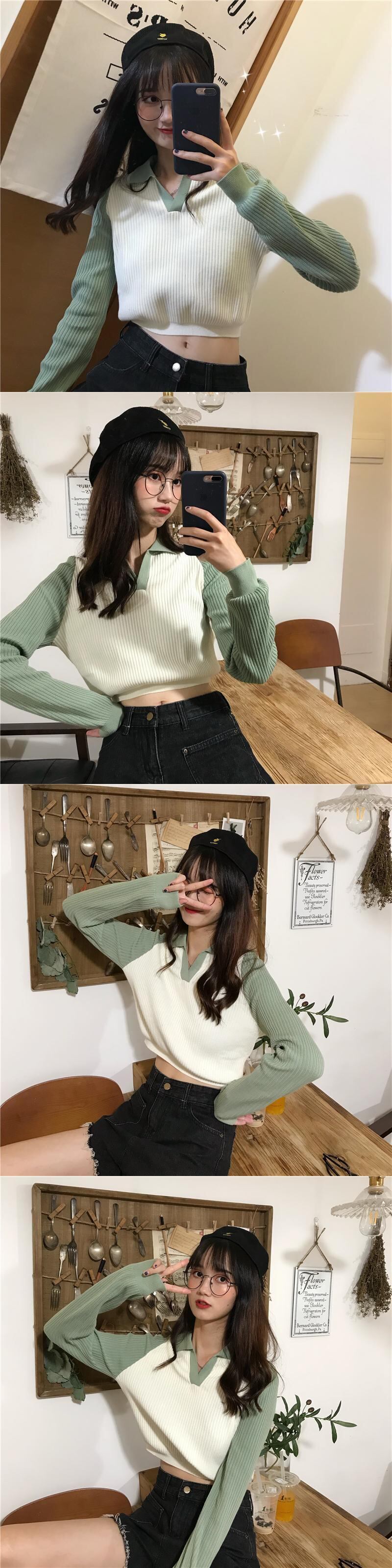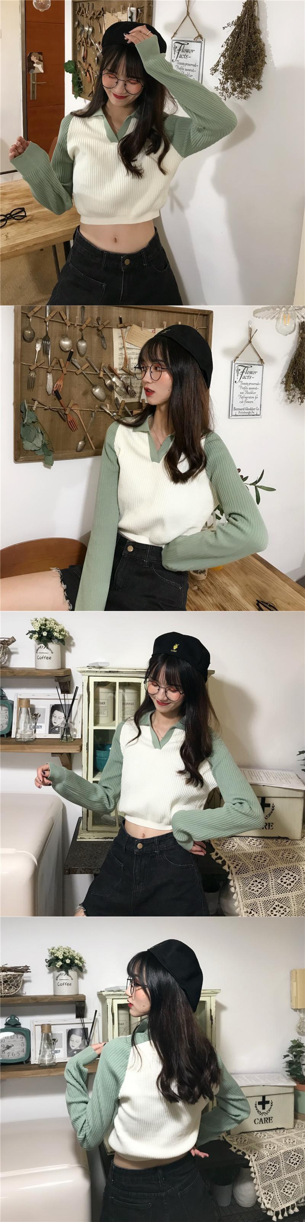 秋物韓国ファッションルーズカラーショートニットセーター トップス NEW ロング オータム ステッチ スタイル 長袖 コーデ Marchs1273887131